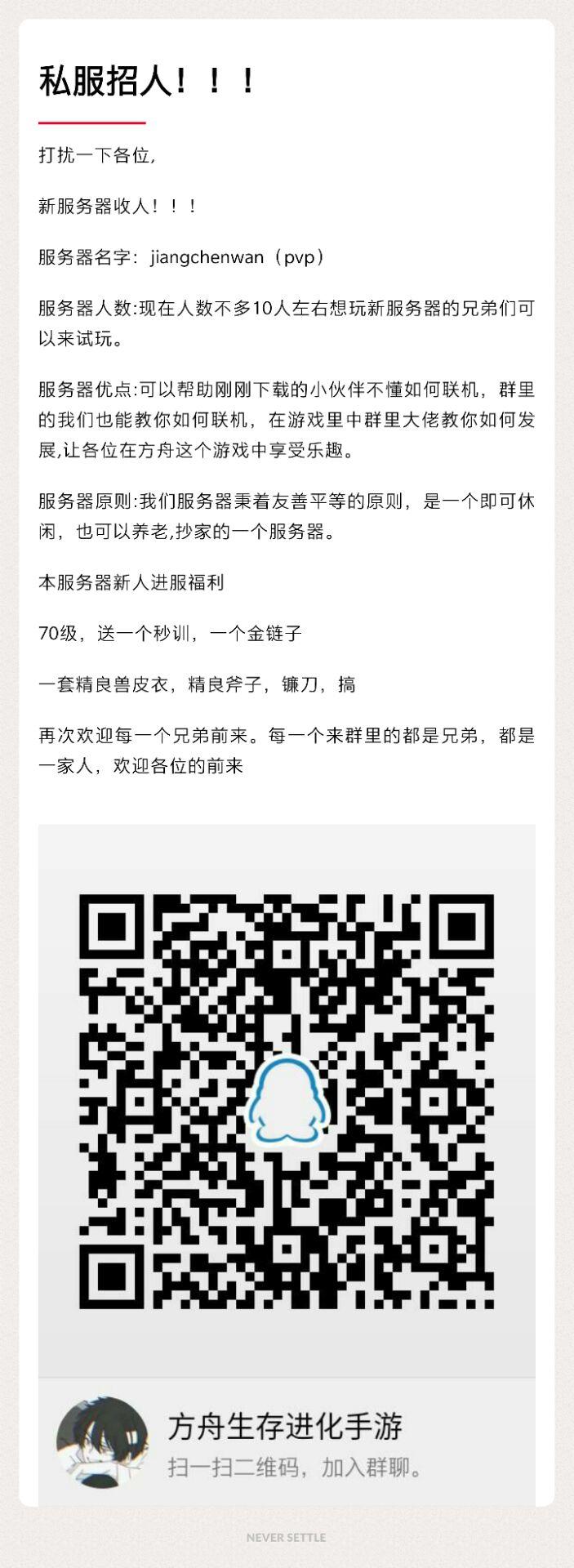 私服招人! ! !打扰一下各位,新服务器收人! ! !服务器名字: jiangchenwan pvp残酷服服务器人数:现在人数不多10人左右想玩新服务器的兄弟们可以来试玩。服务器优点:可以帮助刚刚下载的小伙伴不懂如何联机,群里的我们也能教你如何联机,在游戏里中群里大佬教你如何发展,让各位在方舟这个游戏中享受乐趣。服务器原则:我们服务器秉着友善平等的原则,是一个即可休闲,也可以养老,抄家