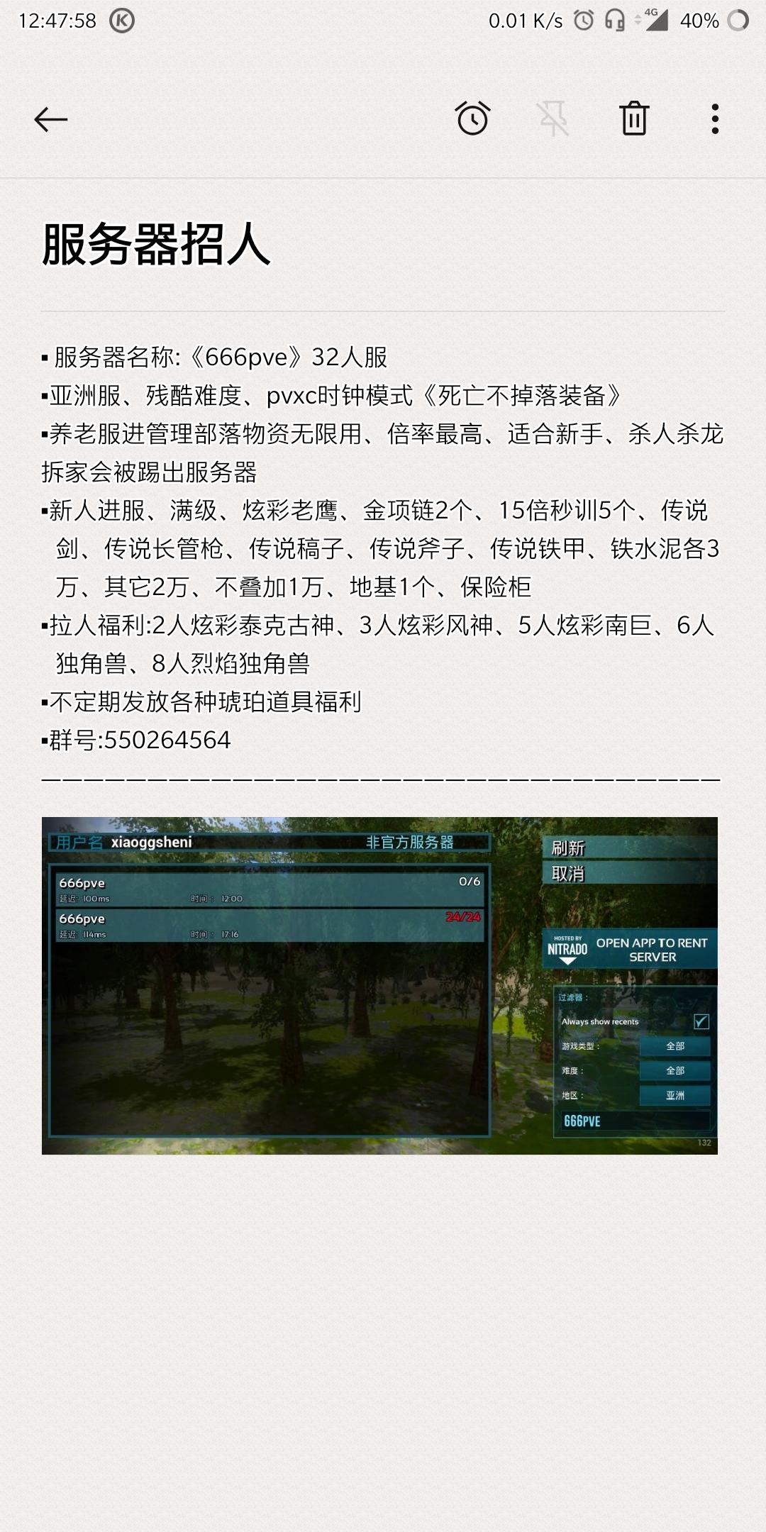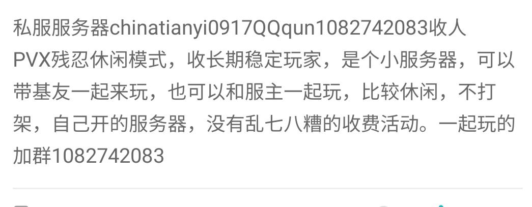 方舟生存进化手游服务器名称: JiShengWQ困难PVP2倍经验,3倍采集爆率,20人中等服务器(人多会扩)新人保护期3天群名片、游戏名统一后截屏找服主升85(满级没游戏乐趣)或者自己打到20级找服主要双倍新人物资。然后到60级再找服主升满新人物资:一万铁五千水泥三千聚合物。被抄家可截图找服主拿部分新手物资,第三次没有对萌新友好,想一起玩的+群545175314服主常在线管事