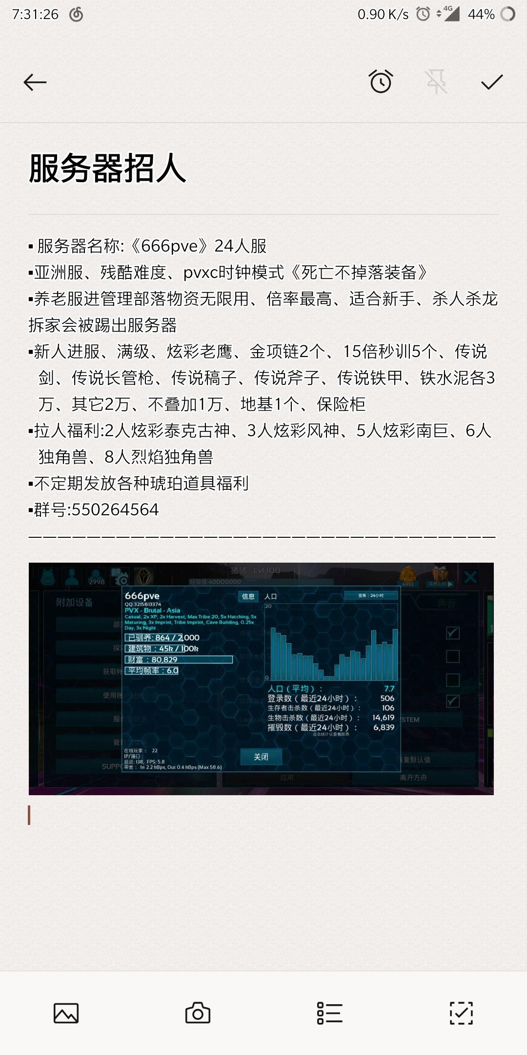 非官方服务器Mark模式:pvx以下是新人物资铁,聚合物,水泥20000基础物资10000而不常用的物资各2000 传说近战套装 剑刀 斧头 稿子 镰刀 一副传说铁甲 传说复合弓(炫彩老鹰一只)邀请人数奖励:(一人俩个秒训)(三人六个秒训加炫彩古神)(五人送十个秒训加泰克霸王龙)(累计达到十人送炫彩南巨)谢谢阅读欢迎加入大家庭 进群备注好,谢谢合作。QQ群:1073244692新开pvx服务器,