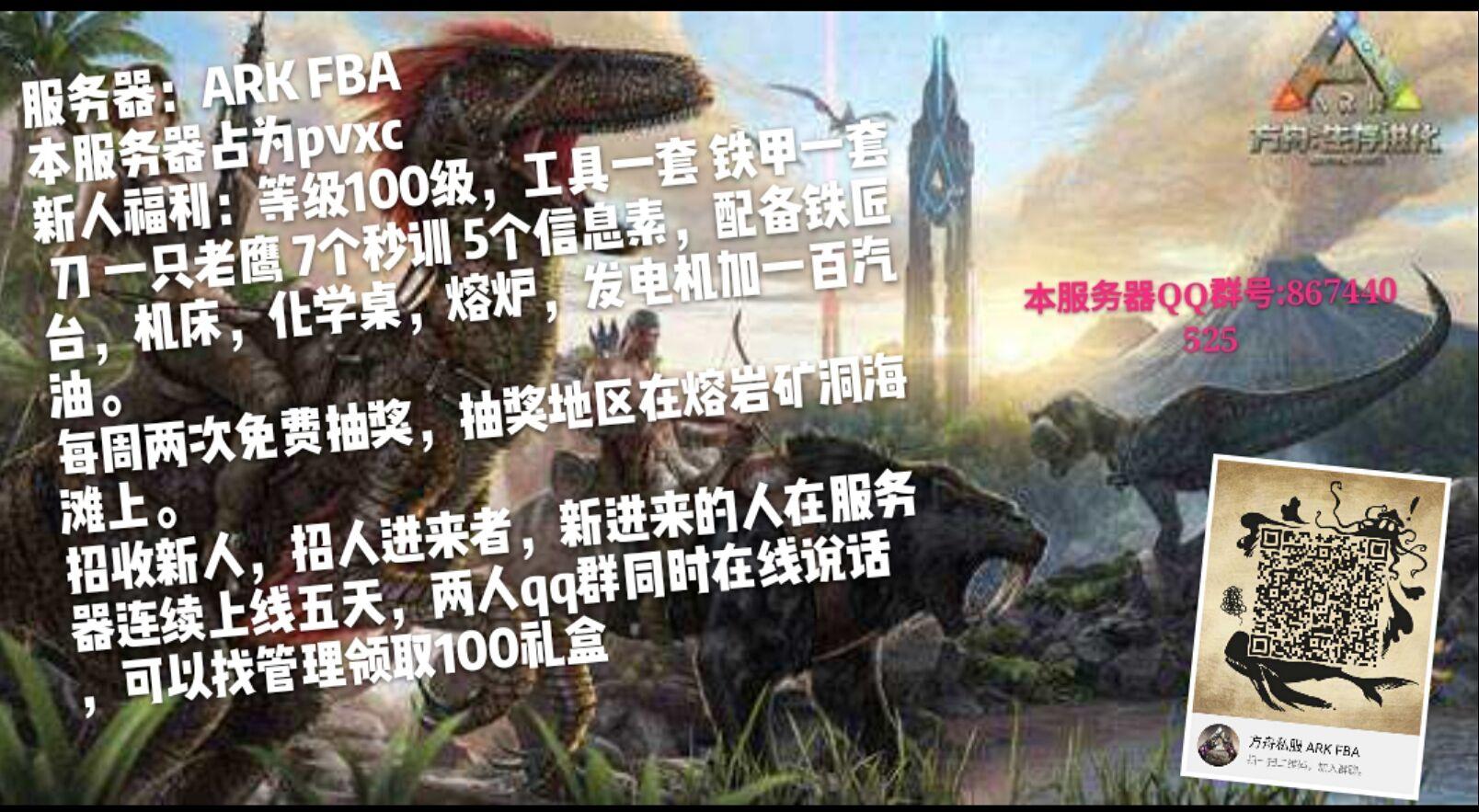 服务器亚洲困难starry50人优质服,进服100级送各种物资1万以及5个秒驯,服务器死亡不掉落服务器设置新人招待所,89.25位置,新人进服直接到招待所报道服务器福利多多,长久在线会送各种琥珀道具,特别欢迎刚接触方舟生存进化萌新来本服务器哦群号:1036920516推广服务器送道具物资啦~