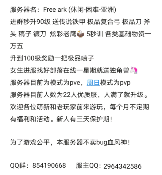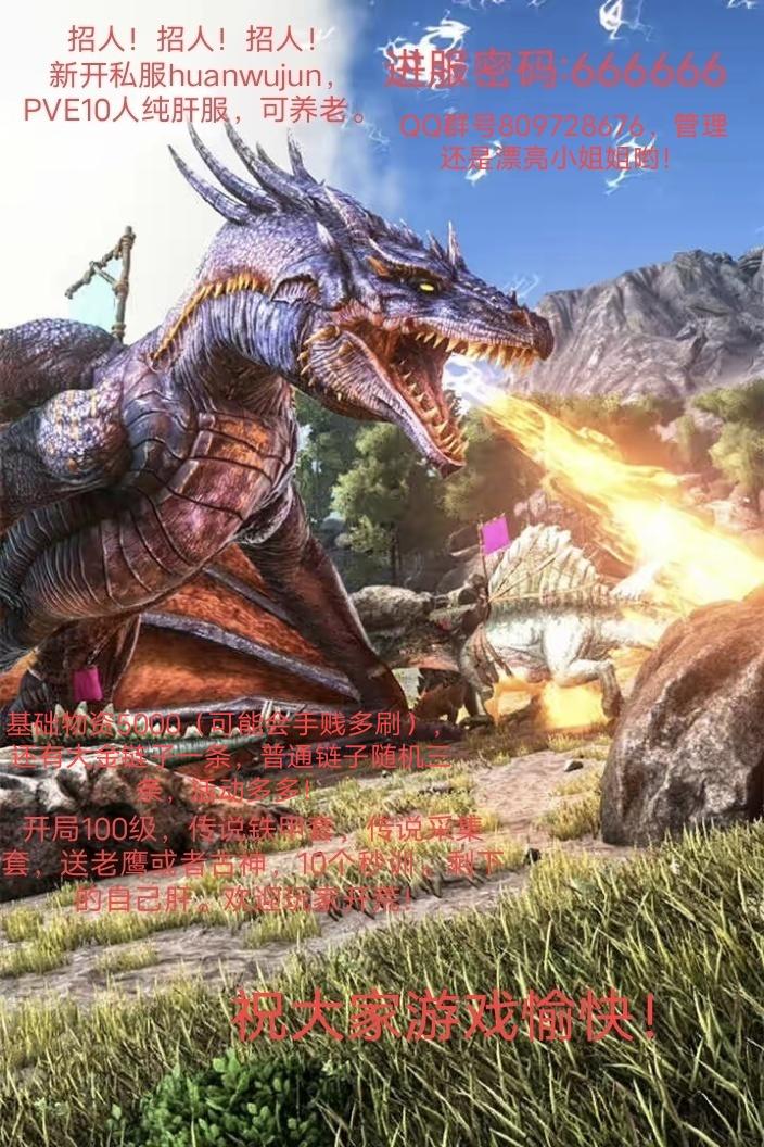 招人!!招人!!招人!!!QQ群聊,1020509486群内有进游戏教程,可带萌新。亚洲纯肝服务器fengxue。周一到周五pve双休pvp活动多,福利多,管理认真负责,不干涉,不参与玩家游玩。新手福利:1,等级福利: 40级2,装备福利 一身6000传说铁甲,传说刀,300攻斧头200攻稿子100攻镰刀3,部落人数福利:部落达两人口送翼龙一只。五人口送悬崖平台一个。七人口
