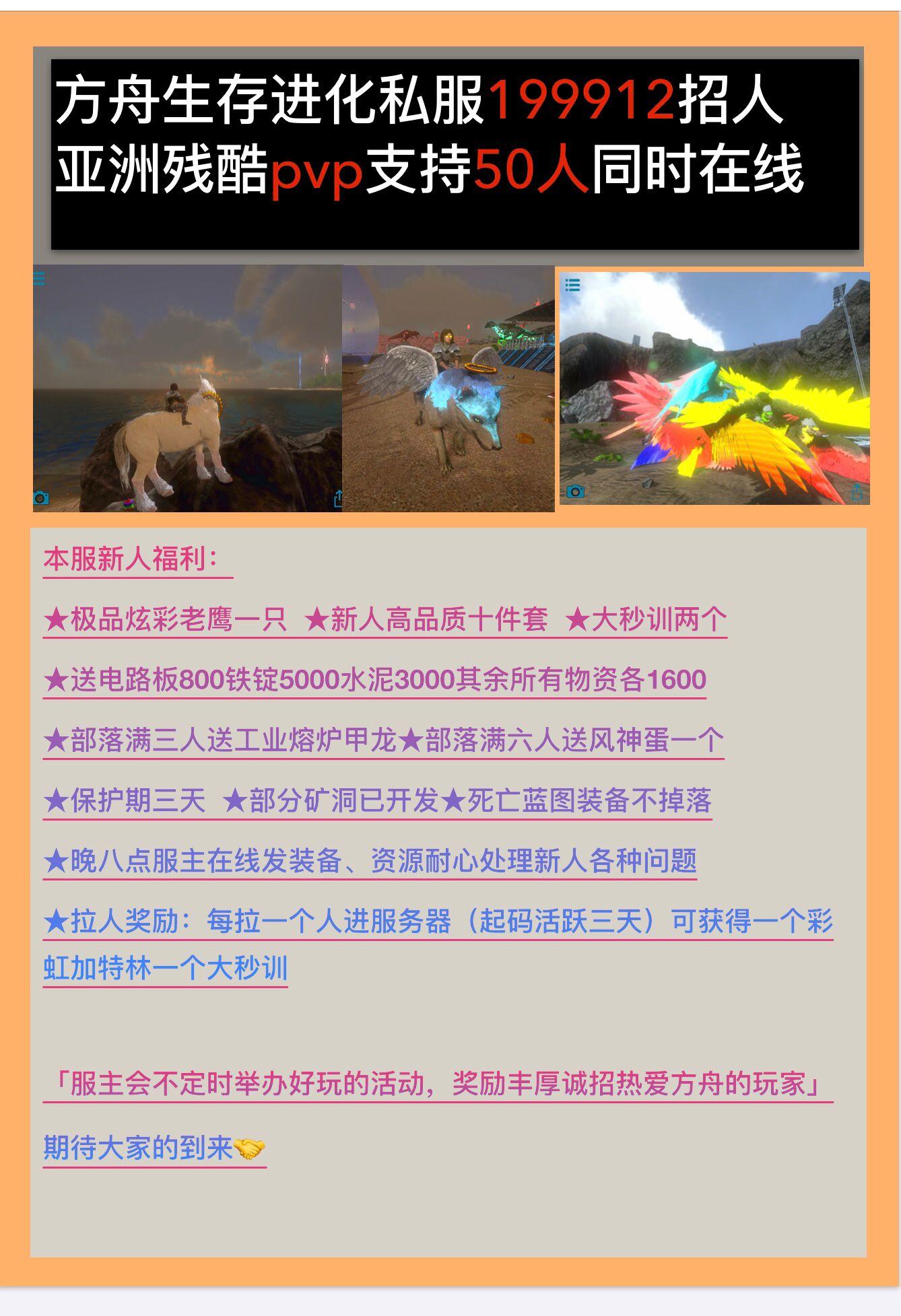 红方舟无限物资送装备一套开局翼龙一只如果不想要翼龙也可以让管理带抓阿根廷巨鹰服主不定期发放各种福利。你还在等什么赶快进服吧!!!