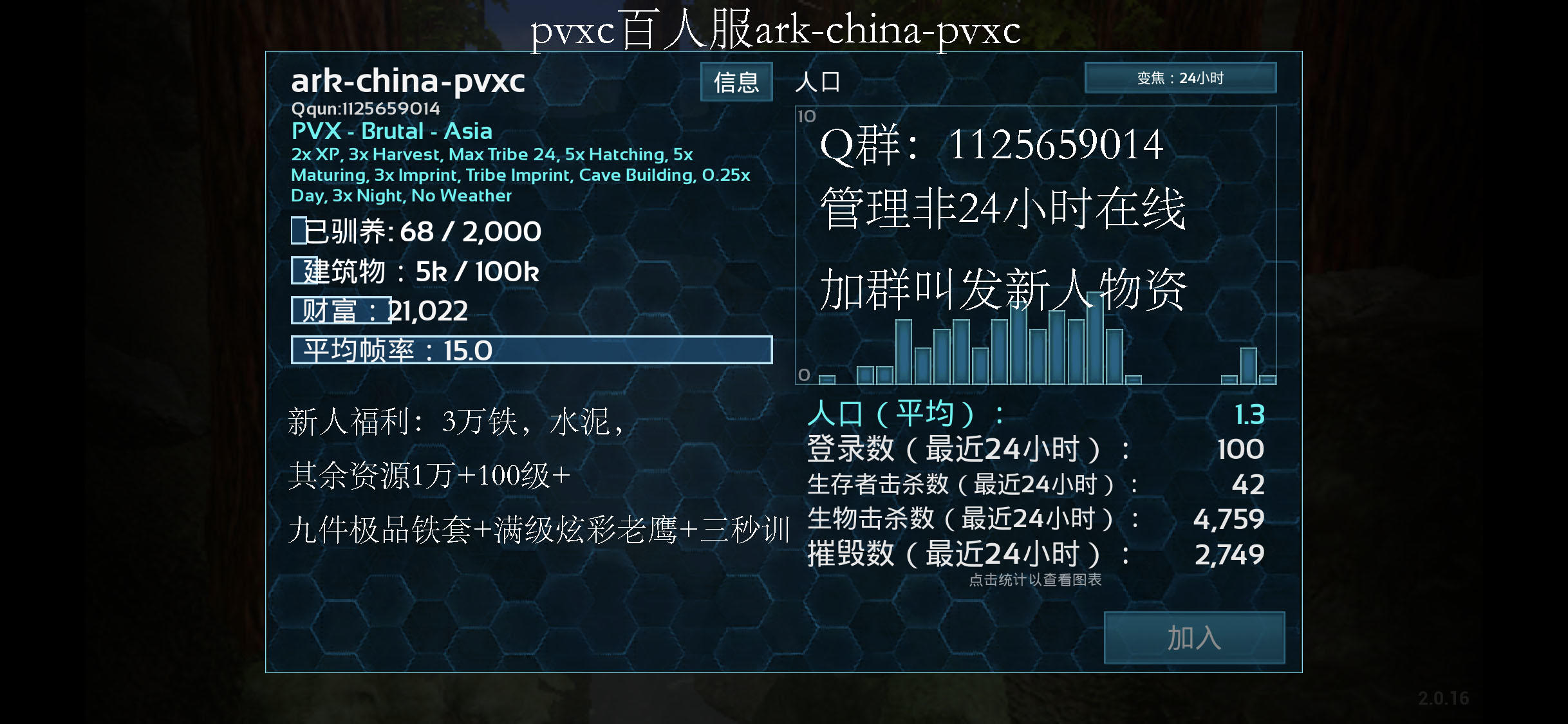 招人!!招人!!招人!!!QQ群聊,1020509486群内有进游戏教程,可带萌新。亚洲纯肝服务器fengxue。周一到周五pve双休pvp活动多,福利多,管理认真负责,不干涉,不参与玩家游玩。新手福利:1,等级福利: 40级2,装备福利 一身6000传说铁甲,传说刀,300攻斧头200攻稿子100攻镰刀3,部落人数福利:部落达两人口送翼龙一只。五人口送悬崖平台一个。七人口