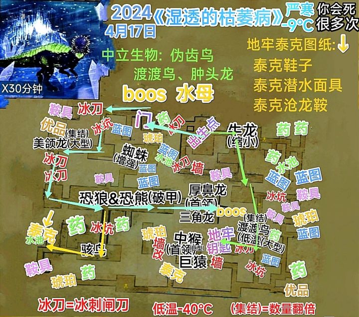 本期地牢为低温地牢:难度高 中立生物: 远古企鹅,大角鹿,窃蛋龙。 地牢科技:泰克手雷,泰克护腿,泰克休眠仓。 怪物种类:剑齿虎、恐狼、双齿形翼龙、水懒、巨河狸、凶齿豨、牛龙、异特龙、猛犸象、兽头兽。 地牢陷阱:冰刺闸刀,冰坑跳台。((ʚ̴̶̷́ .̠ ʚ̴̶̷̥̀ ू)ノシ 【】地牢BOOS:银背金刚。(见视频1:40秒) 1:剑齿虎&恐狼:一般难度,随便打。 2:猛犸象(低温):一般