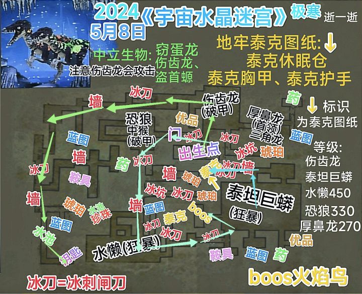 本期地牢为常温地牢:难度一般 中立生物: 渐新象,跳鼠,似鸡龙,跳鼠。 地牢科技:泰克盾牌,泰克巨齿鲨鞍,泰克头盔。 怪物种类:迅猛龙、猪鳄、帝鳄、霸王龙、大地懒、魔鬼蛙。 地牢陷阱:闸刀,无规律推推墙。((ʚ̴̶̷́ .̠ ʚ̴̶̷̥̀ ू)ノシ 【】地牢BOOS:火焰鸟。(见视频1:06秒) 1:迅猛龙(高温):一般难度,站墙脚拿剑清理。 2:猪鳄(首领)&帝鳄:一般难度,平底锅或者