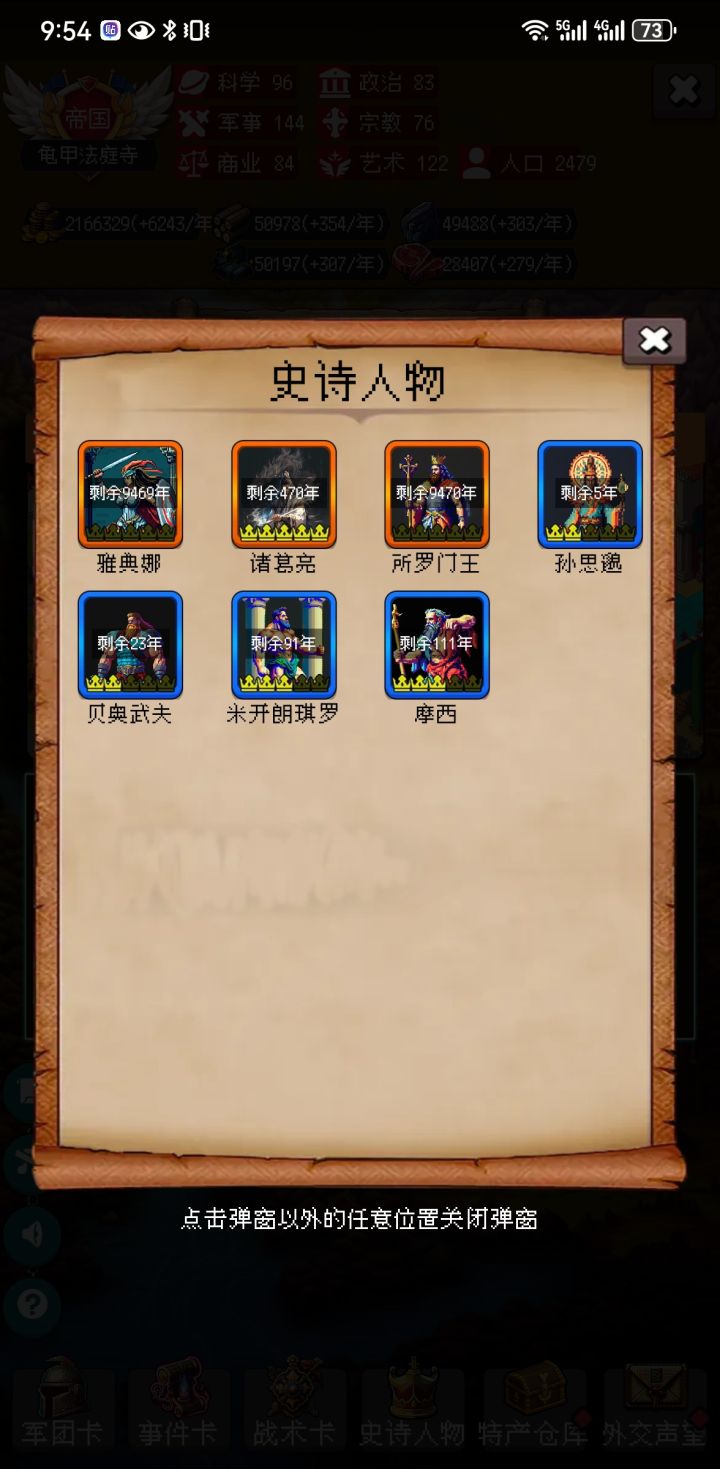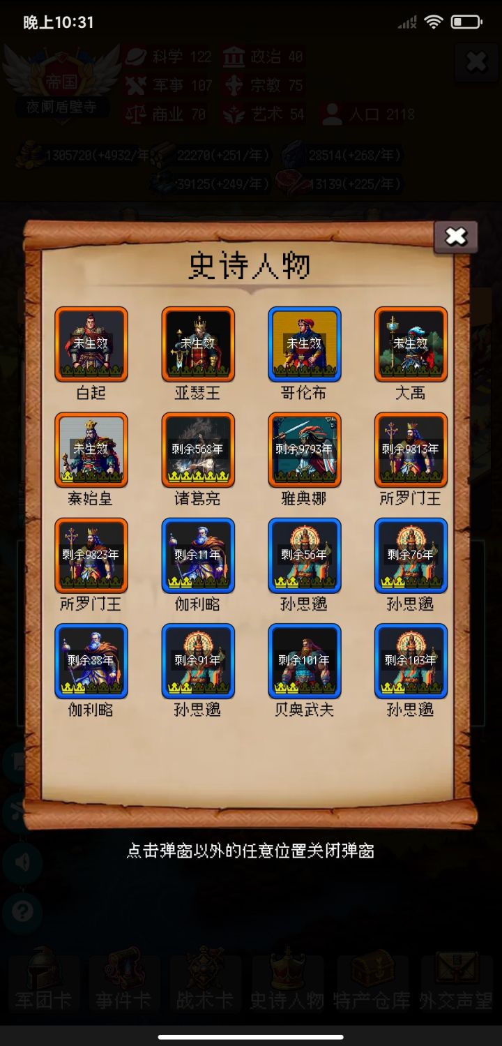 ①开局诸葛亮可以刷奇观,赠送三个军事橙卡人物,然后再开出诸葛亮~ 这是第1种诸葛亮套娃诸葛亮手法(有三种军事奇观,运气爆表的情况下,可以套出4个诸葛亮,想想就好,可遇不可求)②开局诸葛亮可以刷奇观,赠送三个宗教橙卡人物,然后再开出所罗门王~ 这是第1种诸葛亮套娃所罗门王手法(毕竟所罗门王强度很强,每10年增加攻防兵力,外送一张随机橙卡,所有的氪金卡都可以随机刷出)③开局诸葛亮可以政策,优先
