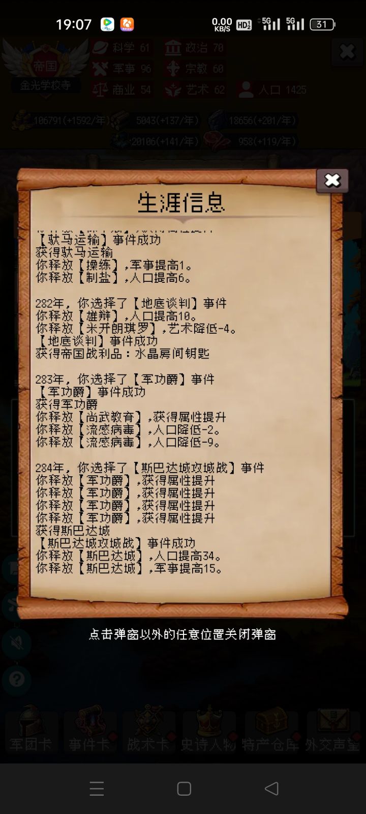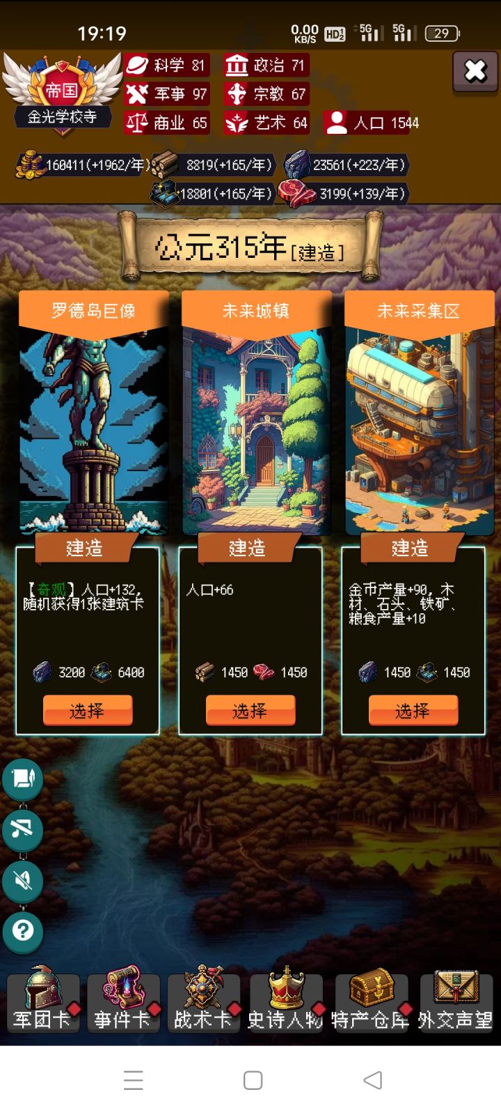 黑土教堂河,持续220年,你超过了0.0%的玩家。公元元年,乐建立了【黑土教堂河】,国家以【象形文字】作为起始科技,国家定都于【遥远林地】,国家将【拜火教】定为国家信仰。公元001年,国家发展了科技【语言】公元002年,国家和亚瑟王朝进行了一次贸易公元003年,国家颁布了政策【武卒制】公元004年,国家和古埃及文明进行了一次贸易公元005年,国家建造了建筑【屠宰场】公元006年,国家