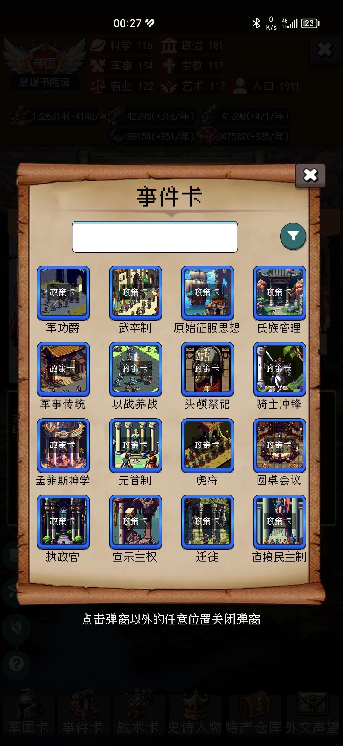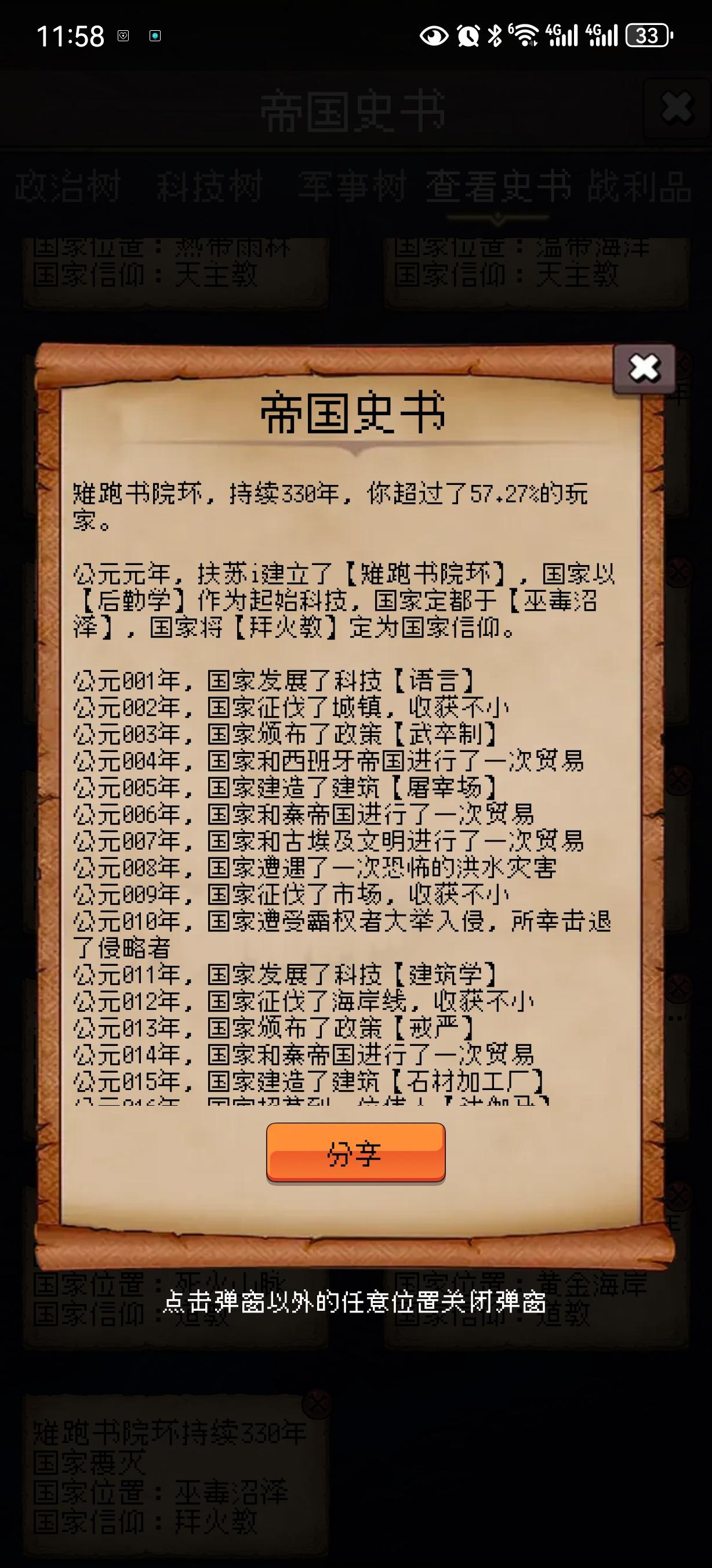 鱼鳍大学州,持续128年,你超过了42.1%的玩家。公元元年,宋扬建立了【鱼鳍大学州】,国家以【钻木取火】作为起始科技,国家定都于【贫瘠低地】,国家将【天主教】定为国家信仰。公元001年,国家发展了科技【语言】公元002年,国家征伐了市场,收获不小公元003年,国家颁布了政策【武卒制】公元004年,国家和秦帝国进行了一次贸易公元005年,国家建造了建筑【屠宰场】公元006年,国家招募