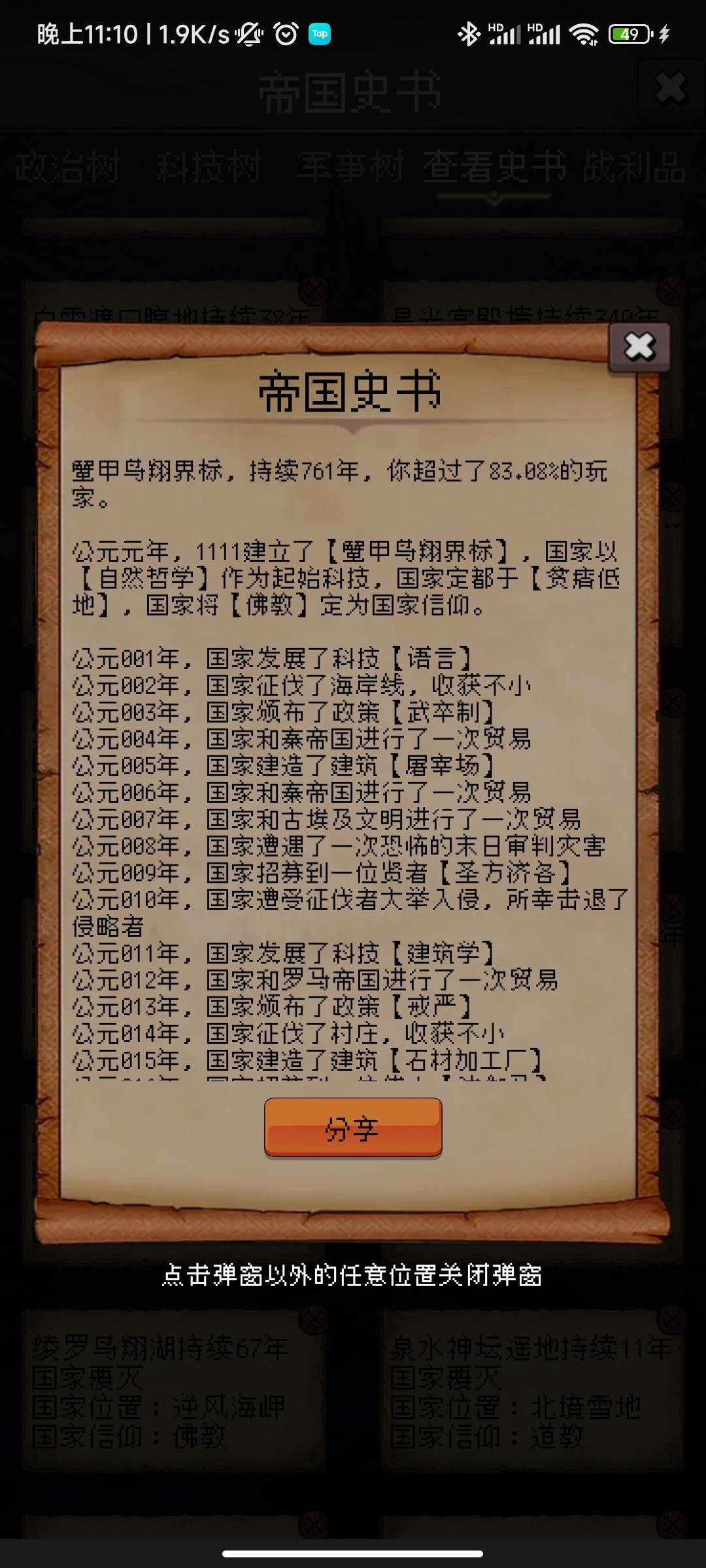 鹤立博物湾,持续224年,你超过了49.31%的玩家。公元元年,User45662417建立了【鹤立博物湾】,国家以【制陶术】作为起始科技,国家定都于【死火山脉】,国家将【道教】定为国家信仰。公元001年,国家发展了科技【语言】公元002年,国家在丛林雇佣兵营招募了【剑士】公元003年,国家颁布了政策【明法申令】公元004年,国家和西班牙帝国进行了一次贸易公元005年,国家建造了建筑【