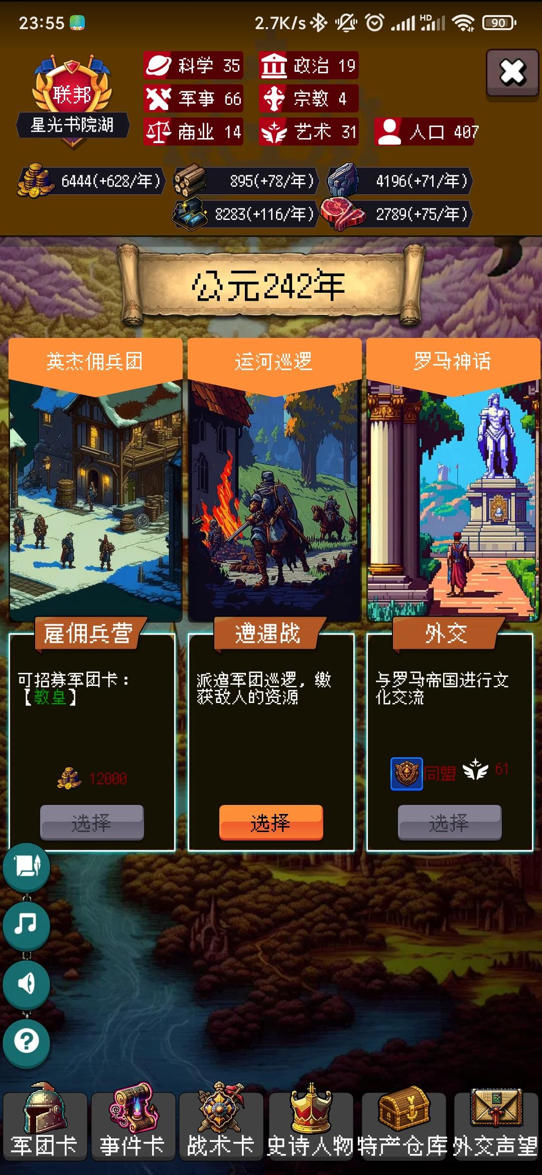 云卷祭司邦,持续190年,你超过了46.76%的玩家。公元元年,秒速五厘米建立了【云卷祭司邦】,国家以【祭祀神邸】作为起始科技,国家定都于【新月半岛】,国家将【道教】定为国家信仰。公元001年,国家发展了科技【采金术】公元002年,国家招募到一位贤者【圣方济各】公元003年,国家颁布了政策【明法申令】公元004年,国家和秦帝国进行了一次贸易公元005年,国家建造了建筑【屠宰场】公元0
