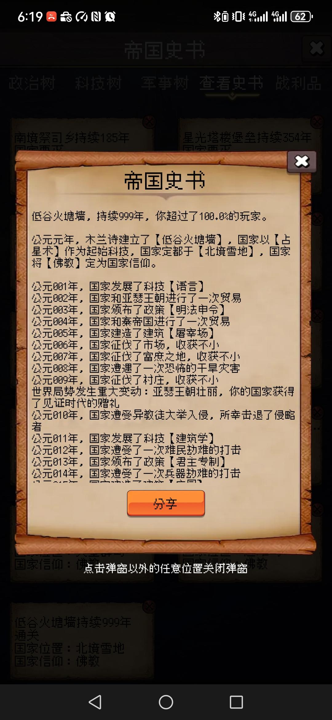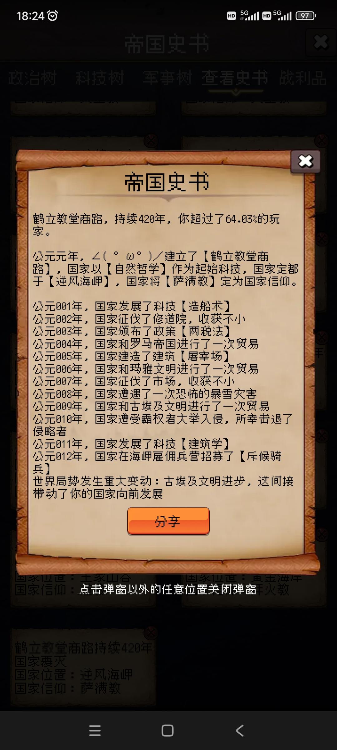 鹿角关隘海,持续230年,你超过了49.76%的玩家。公元元年,地中海最美少年建立了【鹿角关隘海】,国家以【钻木取火】作为起始科技,国家定都于【黄金海岸】,国家将【拜火教】定为国家信仰。公元001年,国家发展了科技【语言】公元002年,国家和罗马帝国进行了一次贸易公元003年,国家颁布了政策【明法申令】公元004年,国家征伐了海岸线,收获不小公元005年,国家建造了建筑【屠宰场】公元