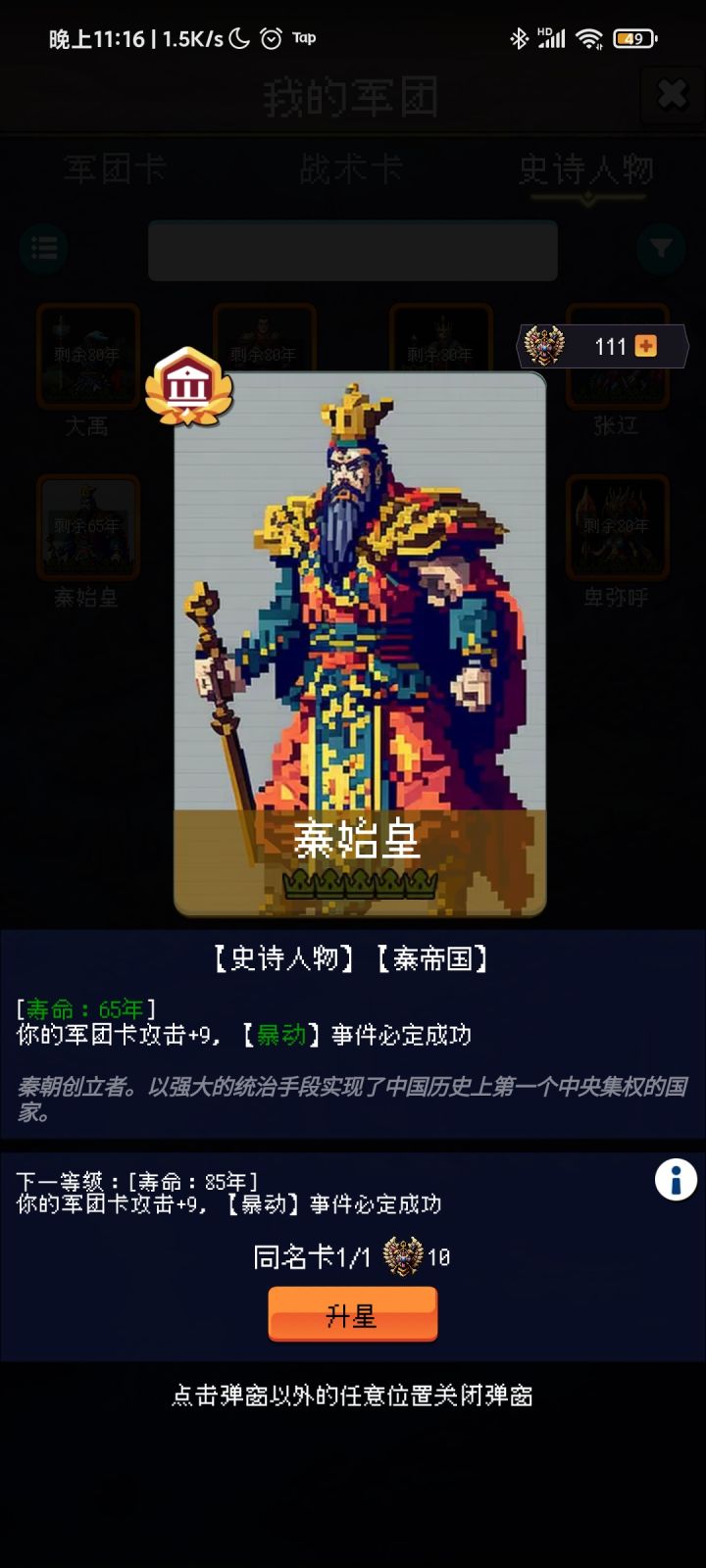 小氪玩家,游戏时间不长,只有一周,属于萌新但你别说,一周就更新了两次,作者团队还挺勤快哎,一次比一次拉第一次,道家一张卡效果是死三个名人换一个,改为自然死亡不算,从此神级化鸡肋,食之无味弃之可惜第二次更牛,直接不刷氪金卡我懂,要恰饭的嘛,不氪金作者团队怎么活呀是吧但是我不懂一个单机小游戏,氪金还真不简单