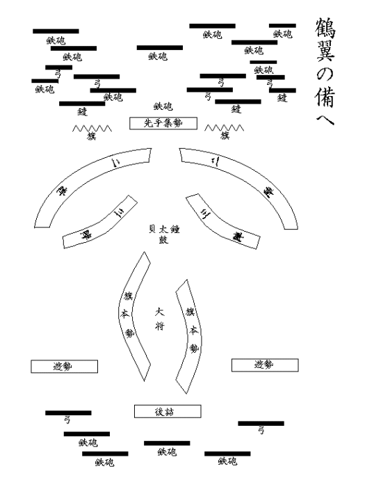 左右包抄是鹤翼阵的战术思想。鹤翼阵要求大将应有较高的战术指挥能力,两翼张合自如,既可用于抄袭敌军两侧,又可合力夹击突入阵型中部之敌,大将本阵防卫应严,防止被敌突破;两翼应当机动灵活,密切协同,攻击猛烈,否则就不能达到目的。