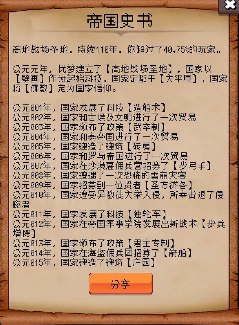 蟹甲庙宇信仰地,持续107年,你超过了40.53%的玩家。公元元年,忧梦建立了【蟹甲庙宇信仰地】,国家以【木制武器】作为起始科技,国家定都于【大平原】,国家将【佛教】定为国家信仰。公元001年,国家发展了科技【造船术】公元002年,国家和秦帝国进行了一次贸易公元003年,国家颁布了政策【明法申令】公元004年,国家和罗马帝国进行了一次贸易公元005年,国家建造了建筑【砖房】公元006