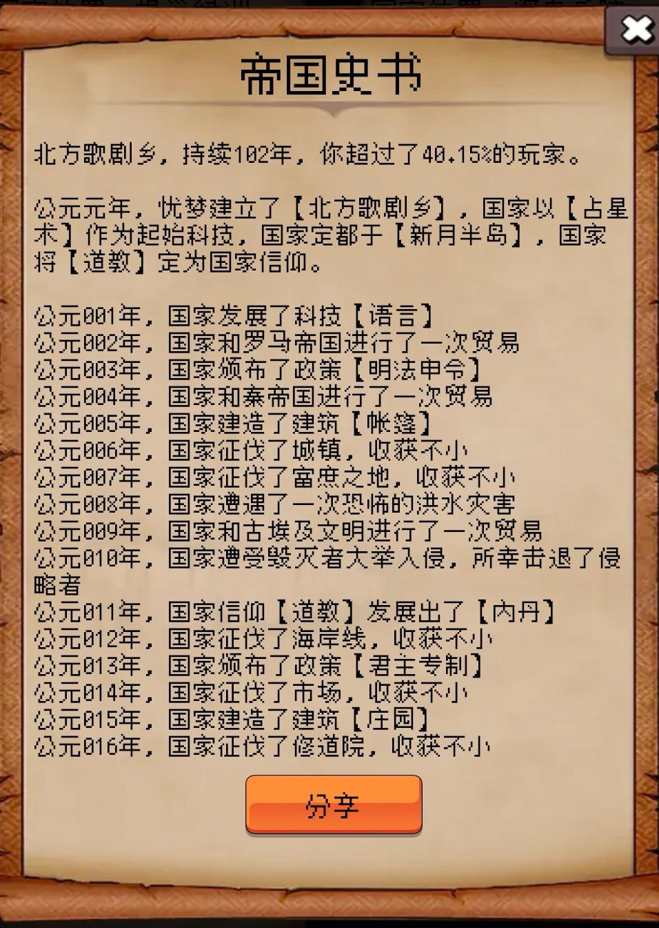 北方歌剧乡,持续102年,你超过了40.15%的玩家。公元元年,忧梦建立了【北方歌剧乡】,国家以【占星术】作为起始科技,国家定都于【新月半岛】,国家将【道教】定为国家信仰。公元001年,国家发展了科技【语言】公元002年,国家和罗马帝国进行了一次贸易公元003年,国家颁布了政策【明法申令】公元004年,国家和秦帝国进行了一次贸易公元005年,国家建造了建筑【帐篷】公元006年,国家征