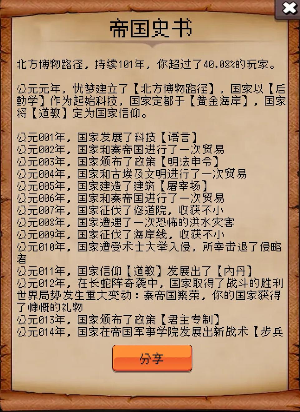 北方博物路径,持续101年,你超过了40.08%的玩家。公元元年,忧梦建立了【北方博物路径】,国家以【后勤学】作为起始科技,国家定都于【黄金海岸】,国家将【道教】定为国家信仰。公元001年,国家发展了科技【语言】公元002年,国家和秦帝国进行了一次贸易公元003年,国家颁布了政策【明法申令】公元004年,国家和古埃及文明进行了一次贸易公元005年,国家建造了建筑【屠宰场】公元006年