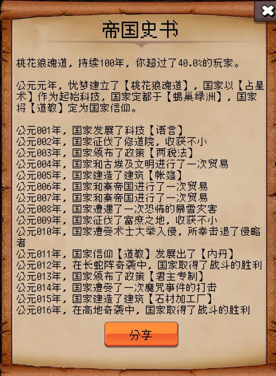 桃花狼魂道,持续100年,你超过了40.0%的玩家。公元元年,忧梦建立了【桃花狼魂道】,国家以【占星术】作为起始科技,国家定都于【蝎巢绿洲】,国家将【道教】定为国家信仰。公元001年,国家发展了科技【语言】公元002年,国家征伐了修道院,收获不小公元003年,国家颁布了政策【两税法】公元004年,国家和古埃及文明进行了一次贸易公元005年,国家建造了建筑【帐篷】公元006年,国家和秦