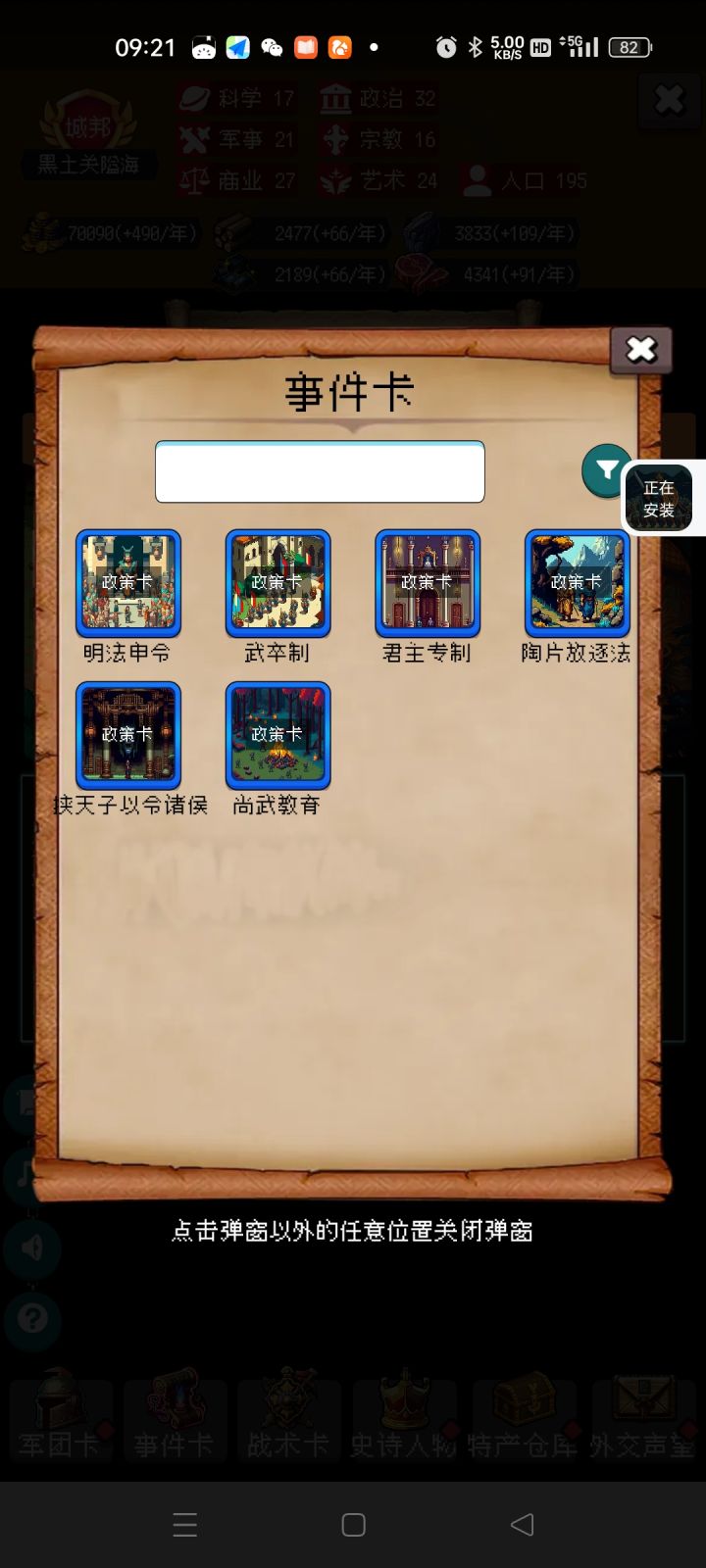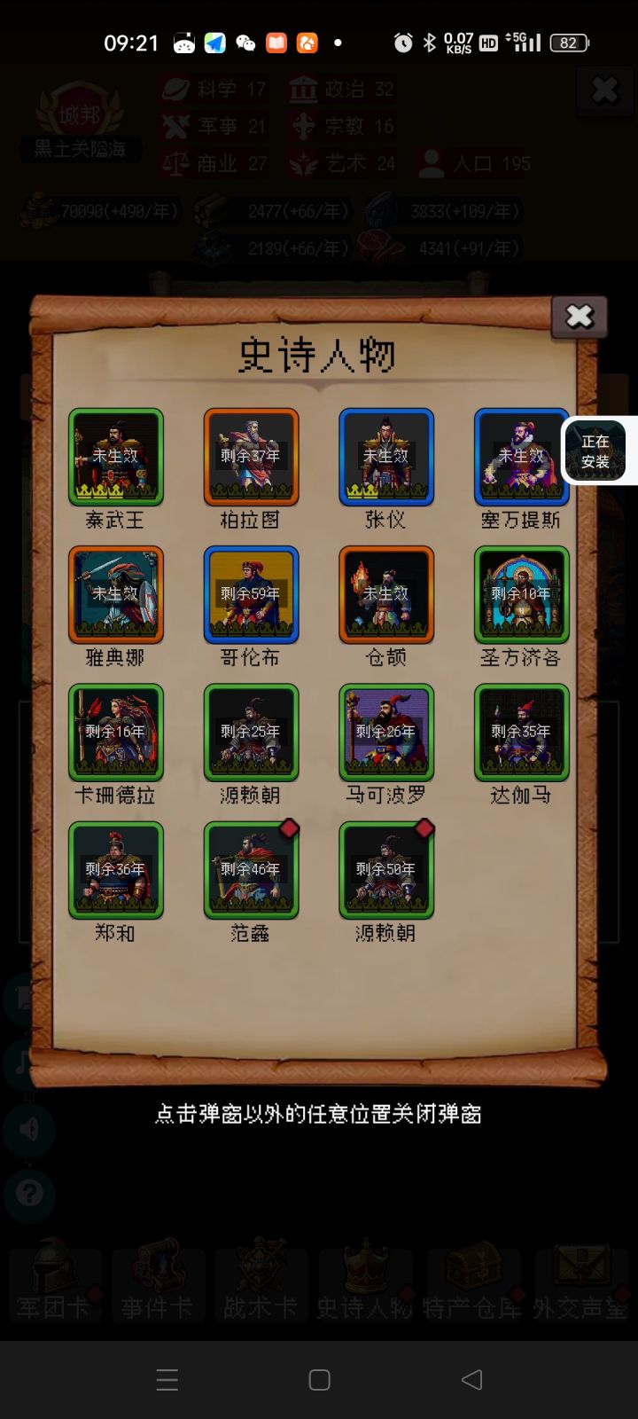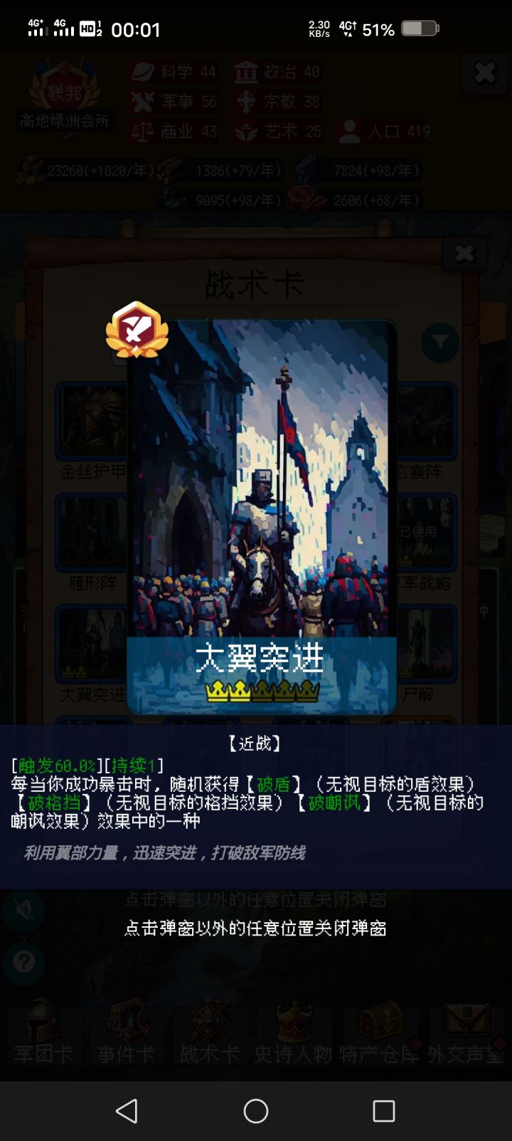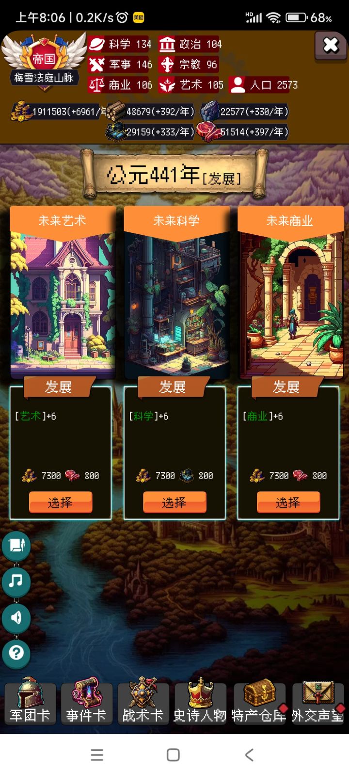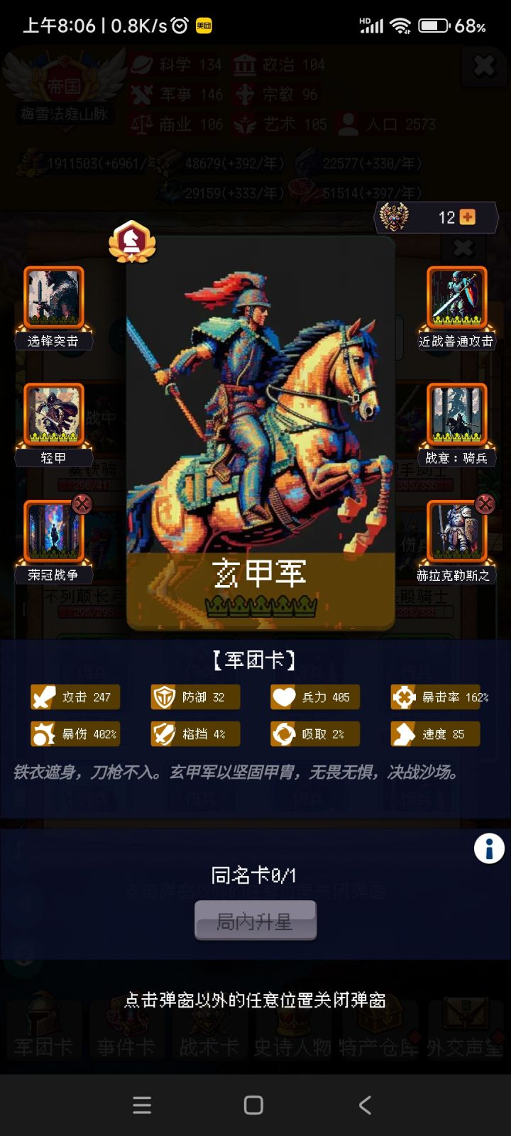 首先是游戏的基础机制十年一个循环的发展,最关键的是每十年的前三年和最后一年。 前三年会选择一个科技和一个政策。科技主要影响国家的属性和产能,政策主要影响军团的属性,但是需要注意的是政策需要属性或者人口达标才能选择,越到后面需要越多,大概一百年左右要到三十多,二百多年需要五六十,300年以后最多也就六十多就够了。每十年的最后一年是入侵战斗,这个战斗如果打不赢损失巨大,一般两次战斗失败就GG了。