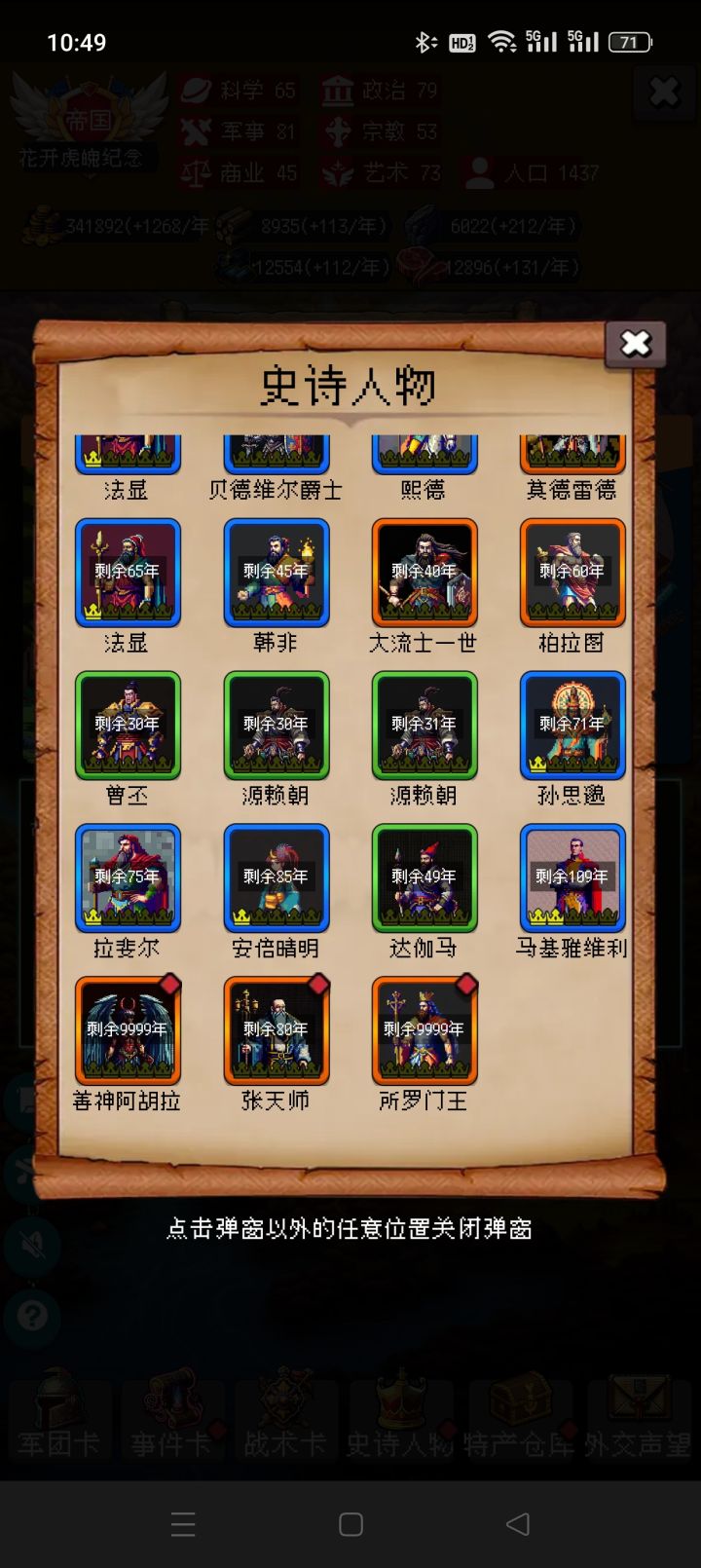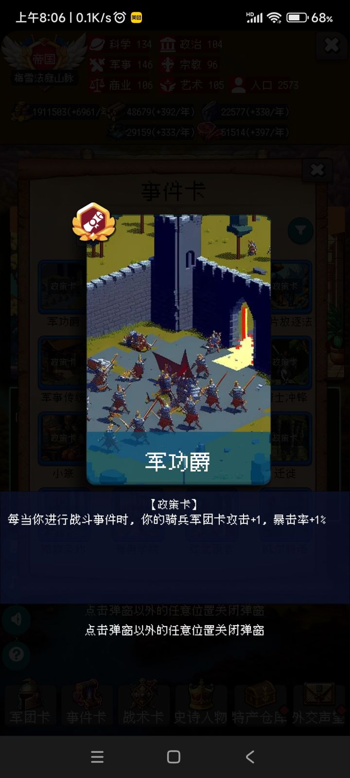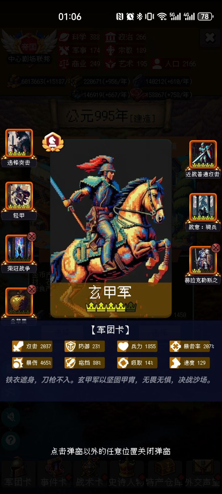 通关后的玩家应该都清楚了,游戏四百年之后基本就是重复刷事件了,一般来讲,这把都能玩到四百年了,那四百年后基本就是毫无意义的刷重复的事件继续叠buff了。所以官方目前真的有必要设定到999年才通关吗?或者有计划更新400年以后的事件内容吗?如图,本把靠橙卡历史人物开局刷了军功爵,以及后面拿了学院+骑兵暴击伤的政策卡,基本无敌了,200年之后都不用刷所罗门了