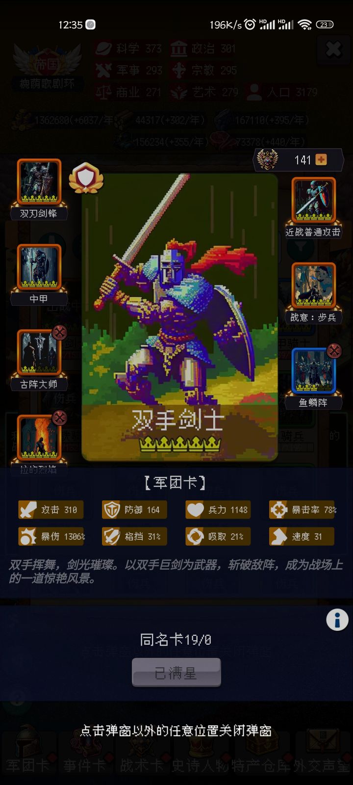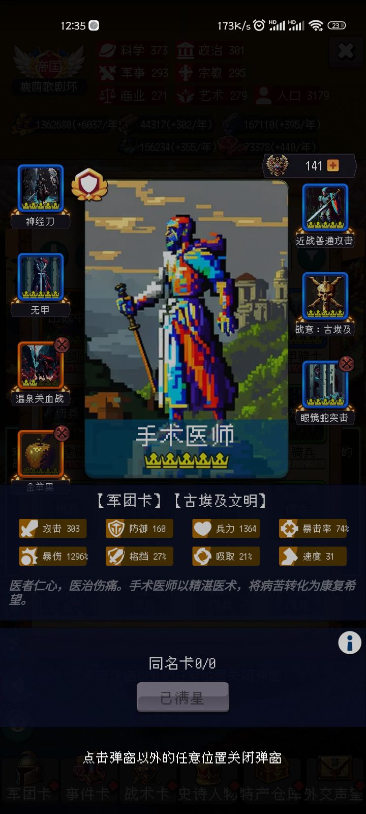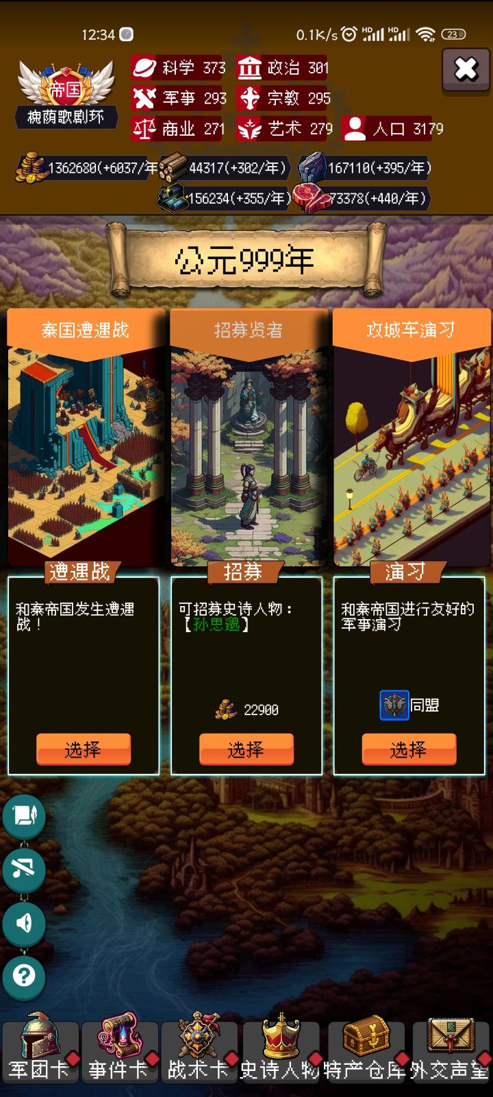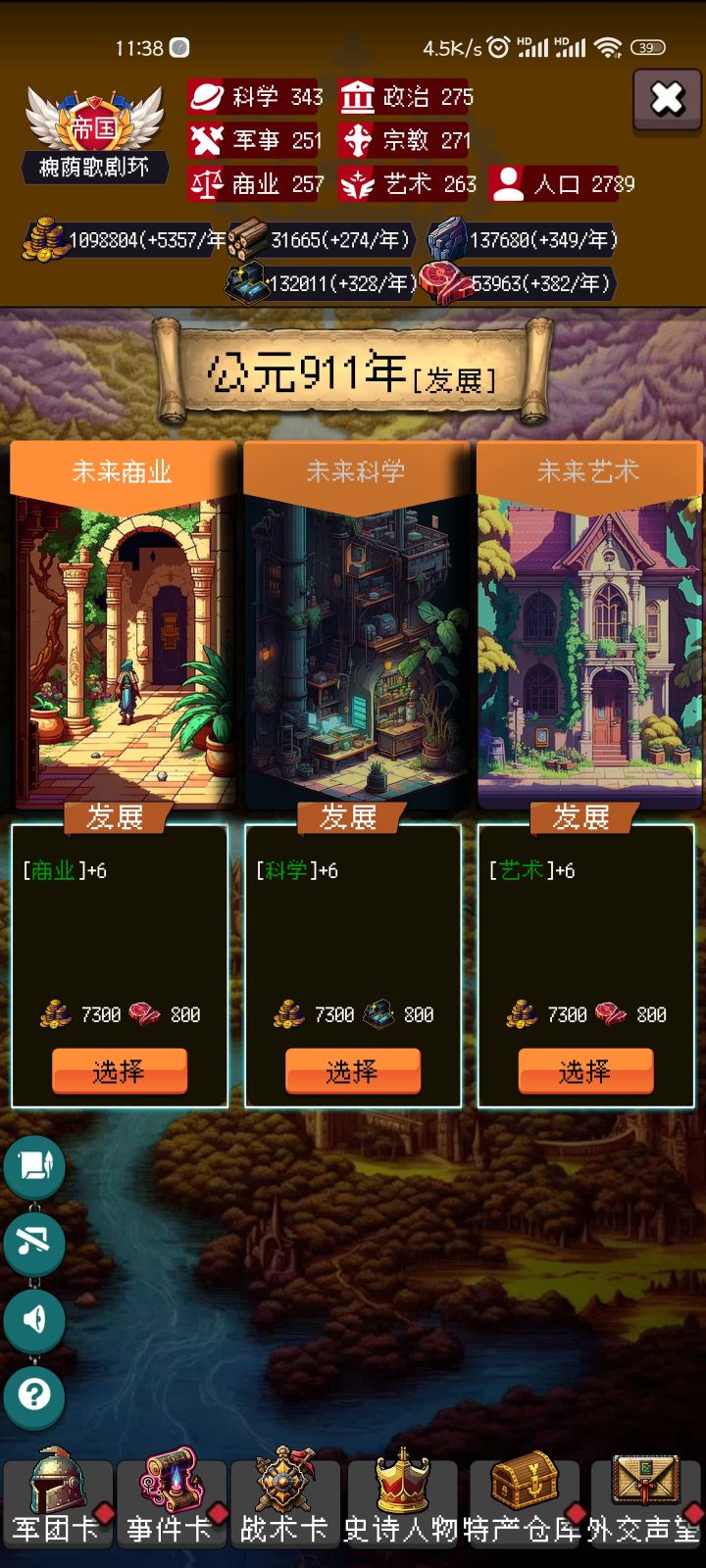 200年你的帝国繁荣昌盛,200年后你就是一个弱鸡,对面都是金卡各种金BUFF加成,对面一轮下来你就去了三分之一的血,你打对面就是挠一挠。而且奇怪的事情各种发生上一年选损失人口和粮食,下一年必定都是粮食选项。(木头,铁,石头都一样)必定要跳过年份。妈呀真惨