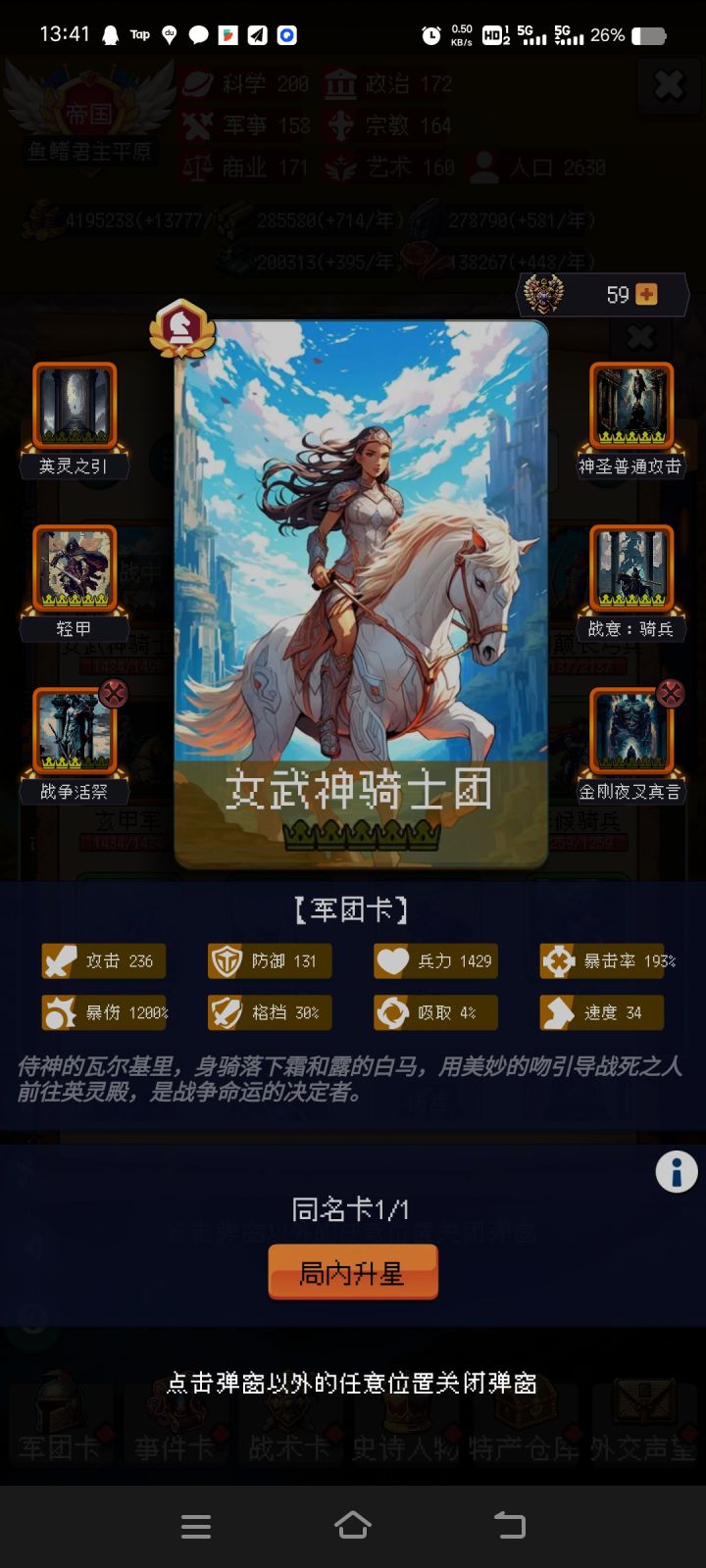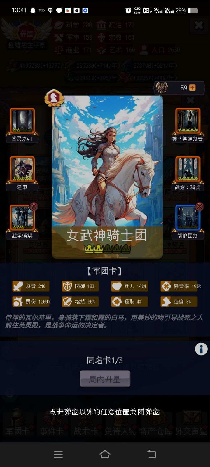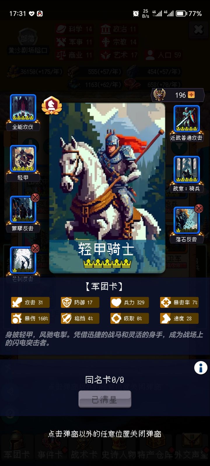 开局带胡狼围攻,柏拉图,哥伦布,女武神骑士,虎骑士选魏国,古埃及,罗马柏拉图刷军功爵政策,点军事传统,携天子以令诸侯,招贤纳士,封建主义,维西尔后期慢慢点格挡,防御,血量,感觉输出不足补爆伤科技里点航海术,木工锯,起重机,化学,畜牧业(不追求这几项全都有)应对危机事件天灾一定小心 千万别碰彗星撞击和冰河期资源产量刷够之后点66人口,方便卖血前期能打就打,后期能不打就不打,满暴击率之