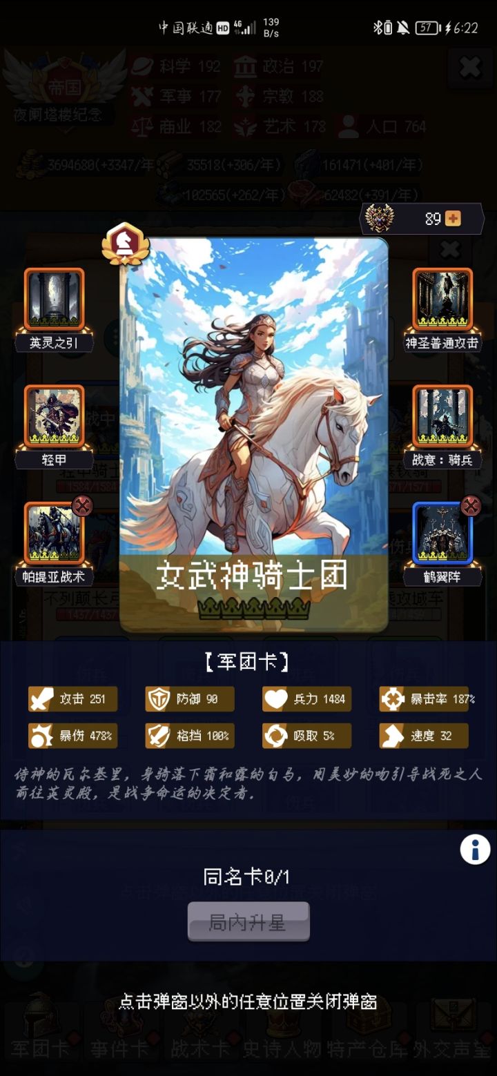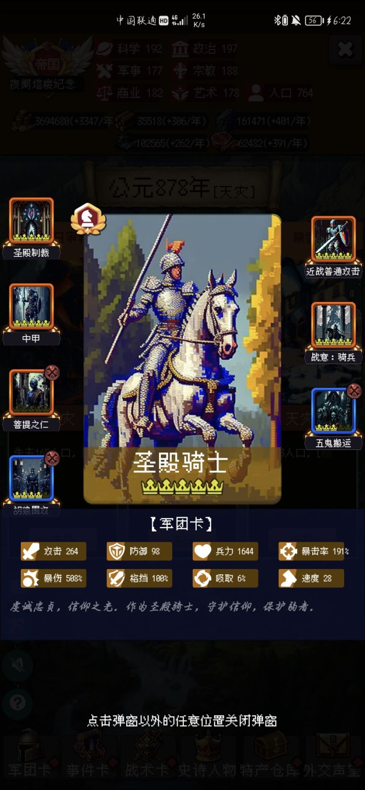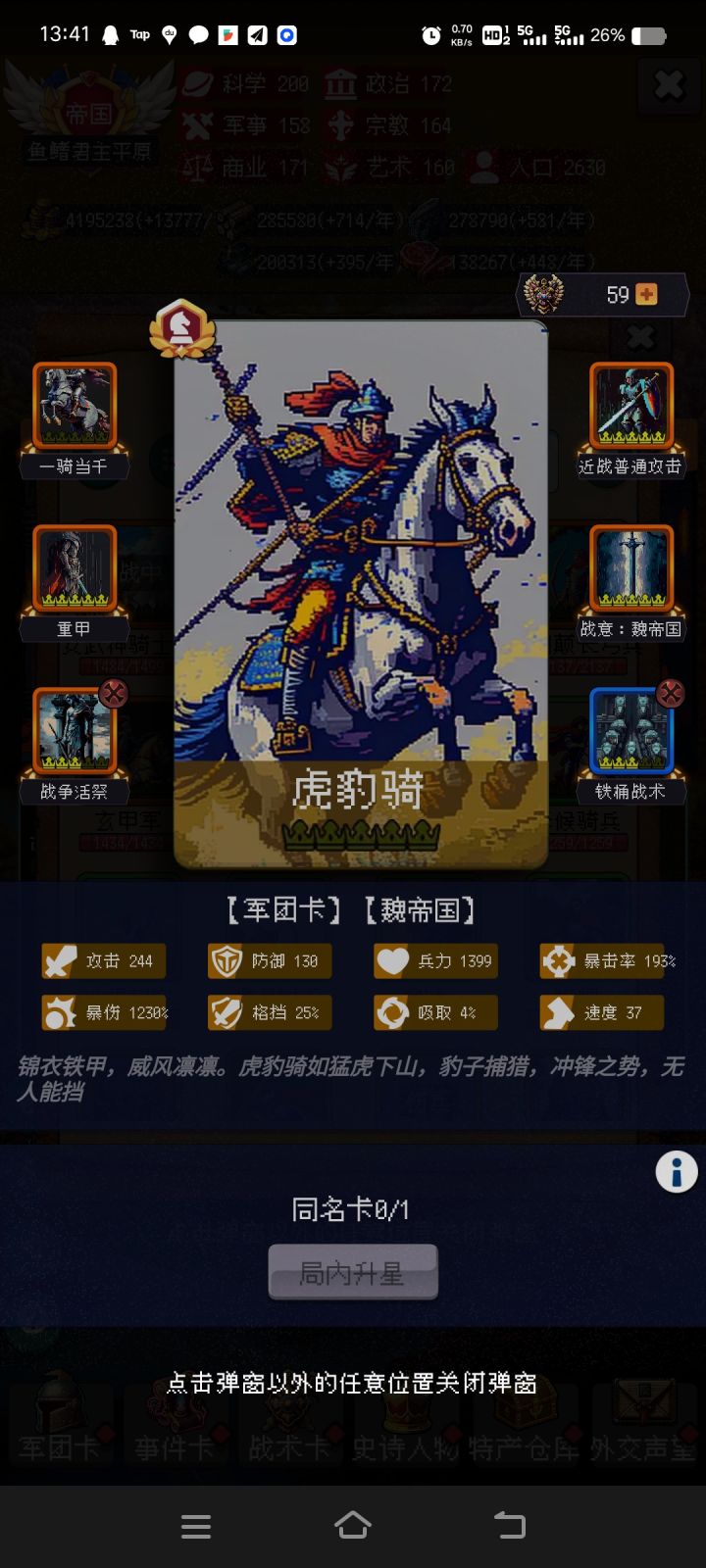 开局带胡狼围攻,柏拉图,哥伦布,女武神骑士,虎骑士选魏国,古埃及,罗马柏拉图刷军功爵政策,点军事传统,携天子以令诸侯,招贤纳士,封建主义,维西尔后期慢慢点格挡,防御,血量,感觉输出不足补爆伤科技里点航海术,木工锯,起重机,化学,畜牧业(不追求这几项全都有)应对危机事件天灾一定小心 千万别碰彗星撞击和冰河期资源产量刷够之后点66人口,方便卖血前期能打就打,后期能不打就不打,满暴击率之