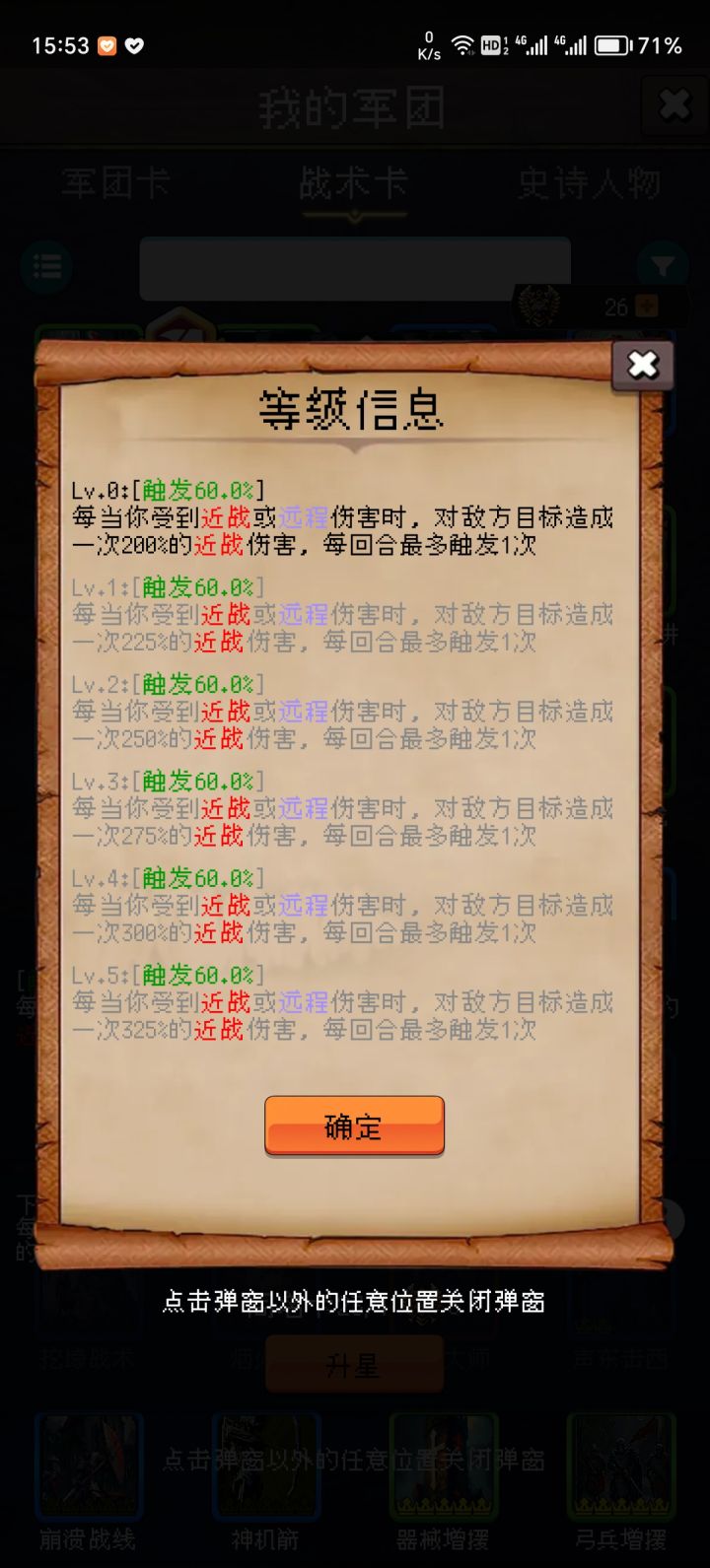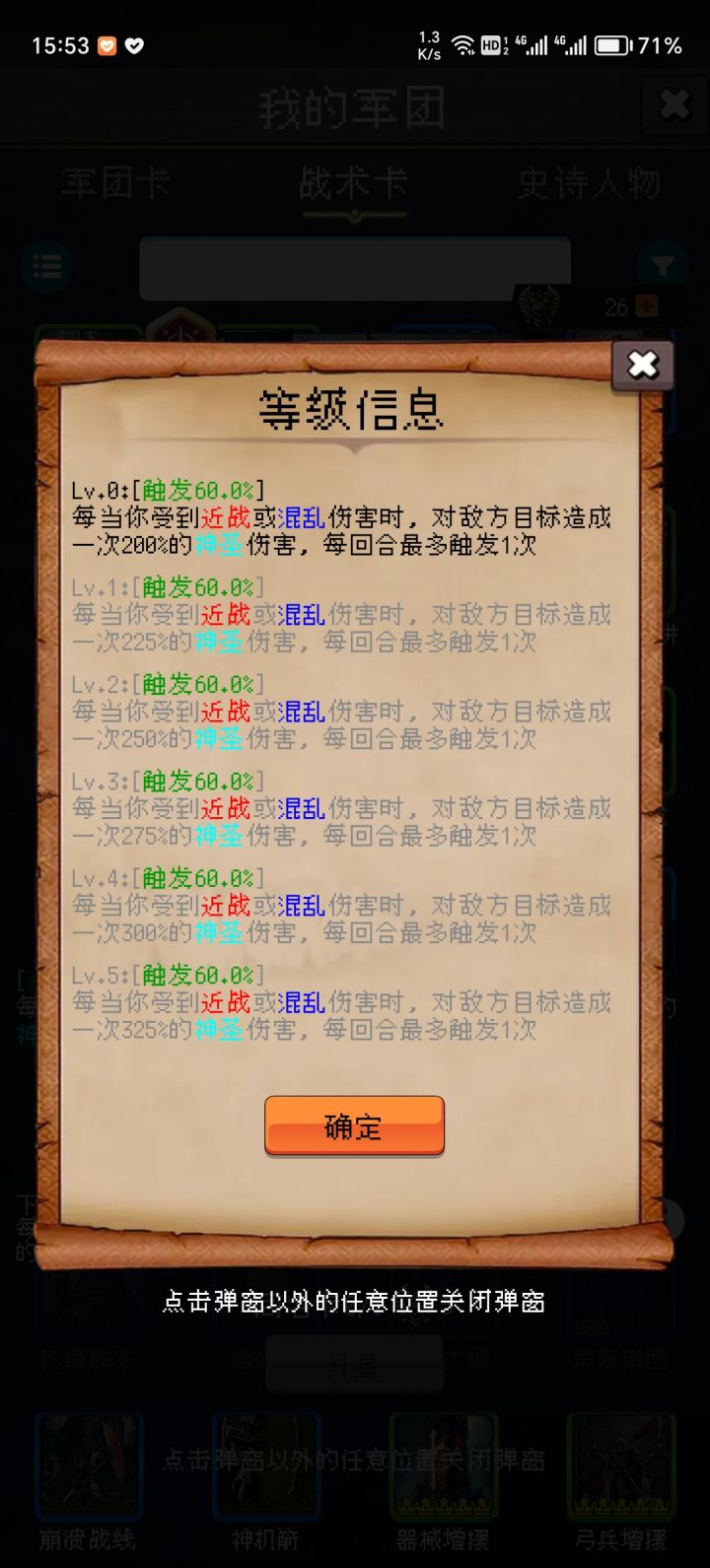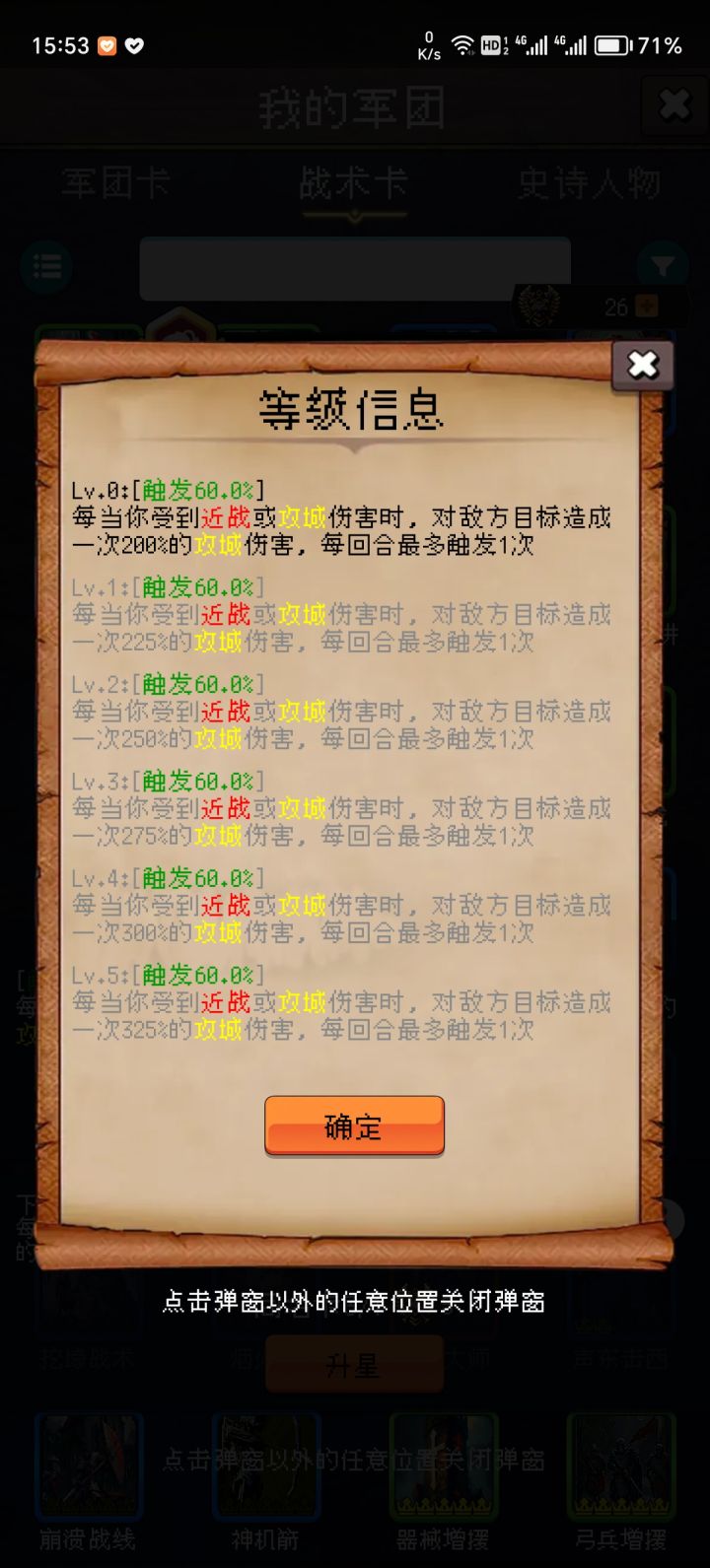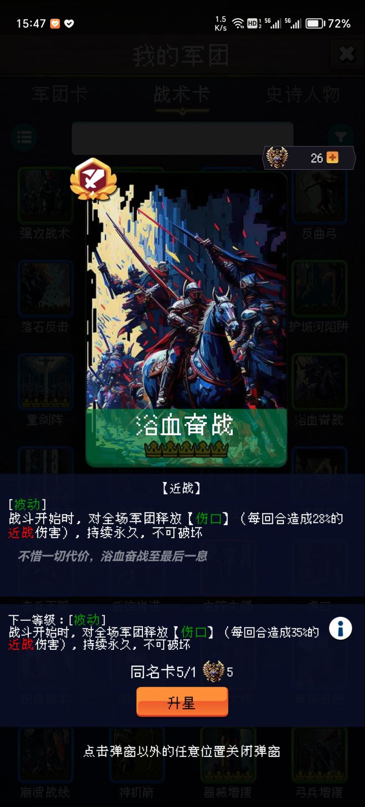 友情提示:浴血奋战仅仅作为各类玩法启动器,0星即为最优解。以下玩法均可配合维京风暴变为群体伤害!最好准备好任意五星蓝色军团卡三张张或四星以上橙色军团卡三张。我准备的是一个五星手术医生,一个五星轻甲骑兵,再任意一个移速低于轻甲骑兵的军团(可以再携带横槊赋诗增加全体友军穿透、卸甲战旗敌方全体减防御),骑兵有神卡胡狼围攻可以全体骑兵无视格挡。玩法配合虎口(高额单体近战伤害);肾上腺素(提供高额