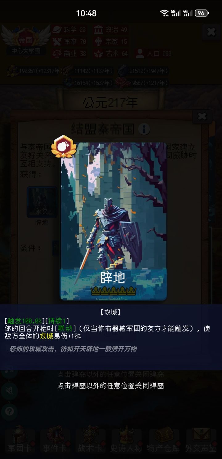 帝国的第99次重生怎么加点?帝国的第99次重生里面开局的话需要选择适合的加点的,那么在开局的时候就可以提升我们的实力了,那么今天就给大家从军事,政治,科技三个方面讲解下,要是不会的话下面一起来看看吧!1.点外面的史书主要是军事>政治>科技2.军事:步甲2→步生存2→骑甲2→射弓2。因为开局没有圣职的军团卡,所以尽量去往步弓骑玩。3.政治:优先募兵制要提前另外俩一个等阶,之后是城镇化那一条路。这边