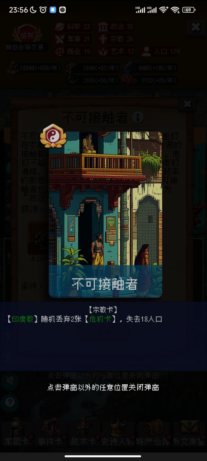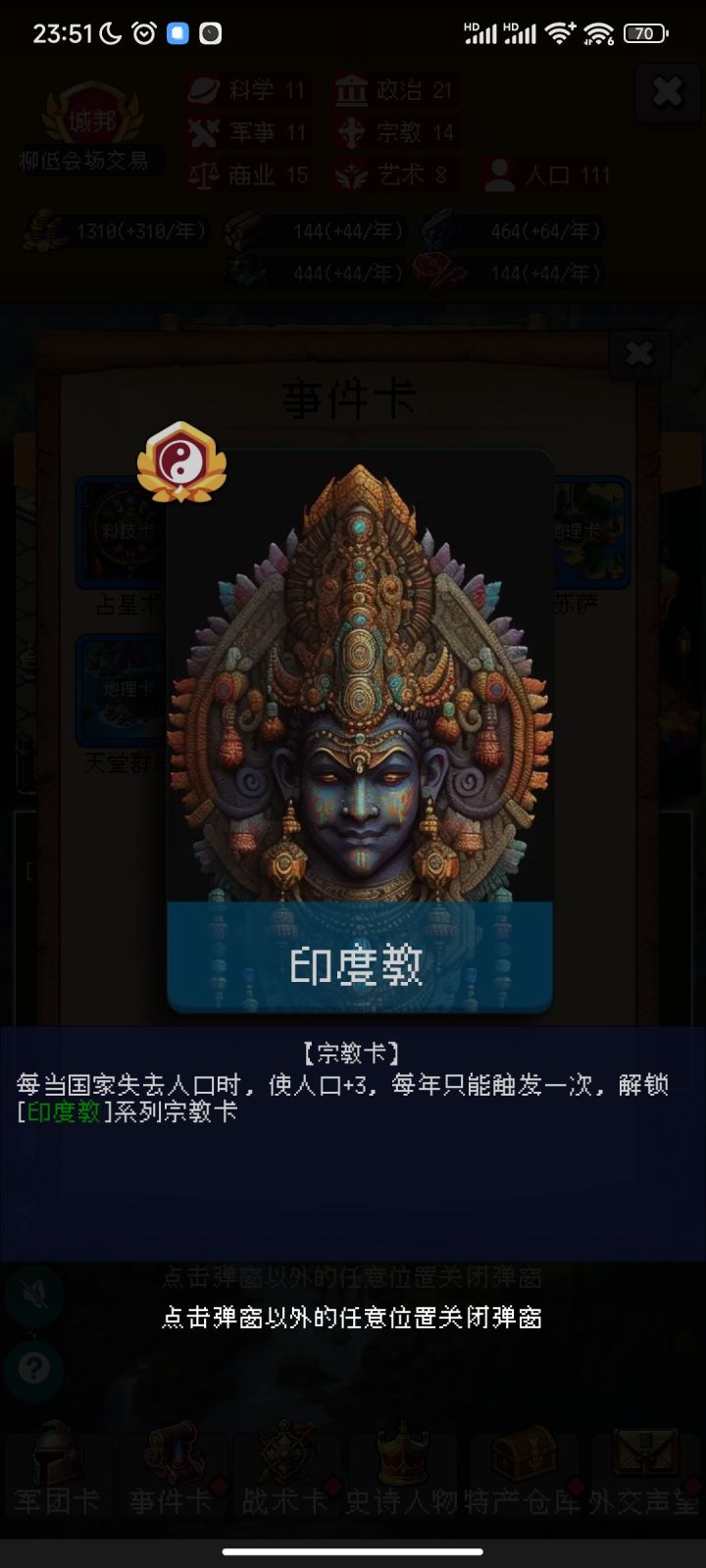 印度教概览,后续还会看看有没有简单来说就是抵消人口减益,不可接触者来的好甚至可以消除危机卡的攻城debuff,而遭遇战-4的危机卡也不再是危机,反而是机遇了。如果消除的危机卡是长老政变(攻城-2人口-2宗教),那么攻城带来的收益可以追赶道教内丹和洞天,从这一点看印度教强度和道教有的拼。