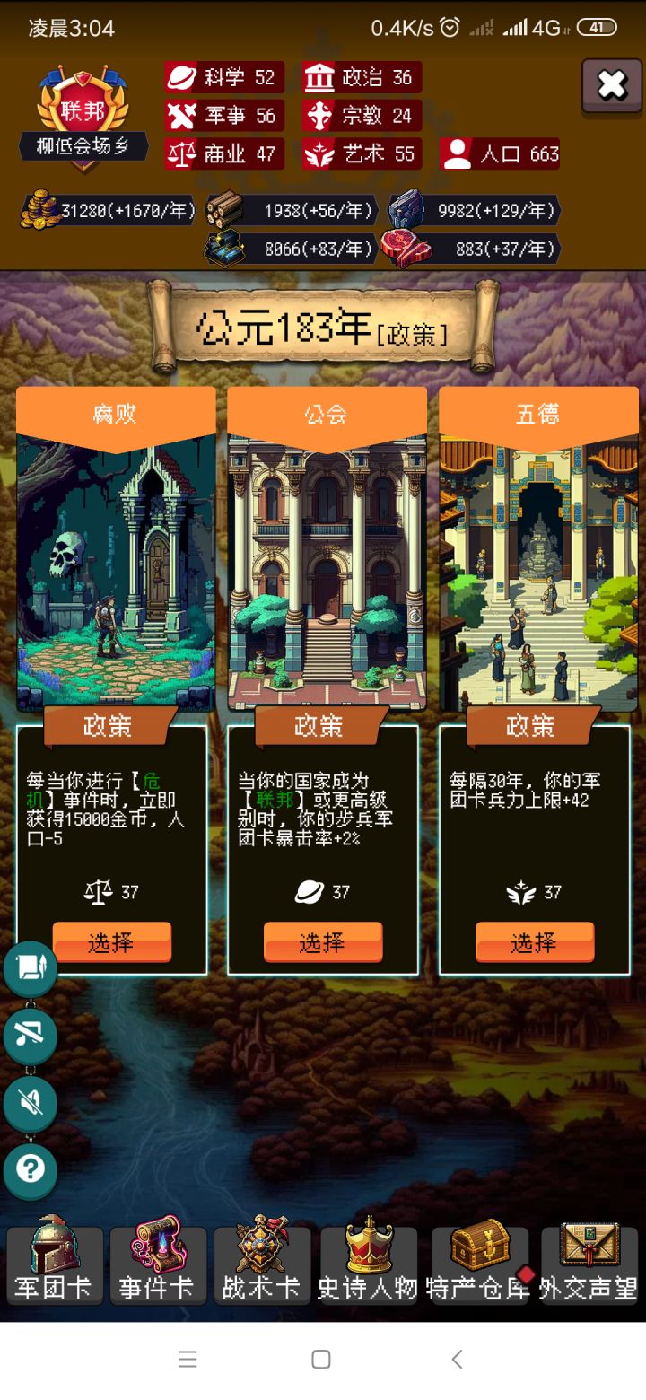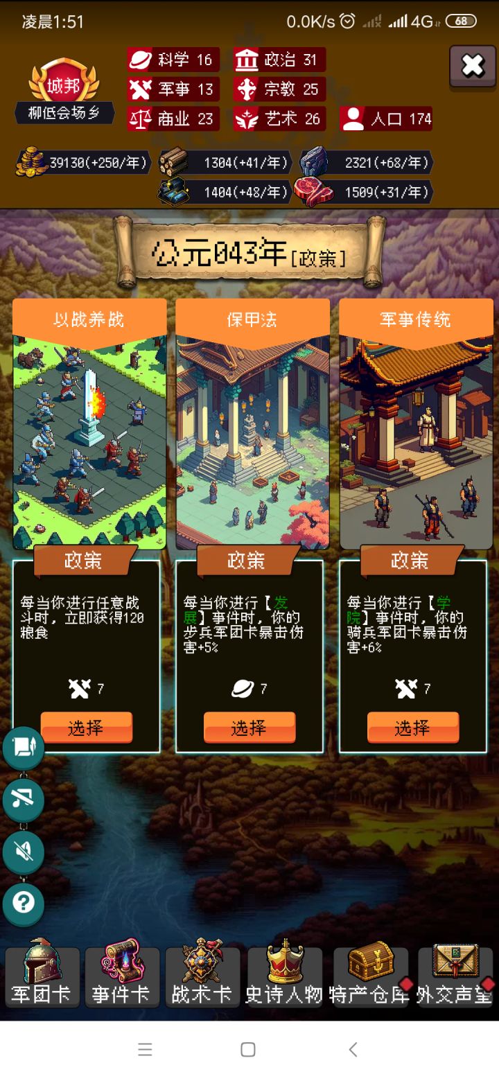 首先,不多bb,先说精华 卡包选择 秦 埃及 斯巴达 魏国。秦有 军功爵 每次战斗骑兵1攻1暴率埃及 维西尔 每次谈判 军团 25血10暴伤斯巴达 尚武教育 每30年4攻魏国 挟天子以令诸侯 每次和谈 军团1防政策抓不到的,在刷新政策之前一年,用备份软件备份手机本地文件,只用备份这个游戏的就够,没刷到想要的政策就还原。还有一下必抓的政策183到203年的五德 通用的 每30年军团4