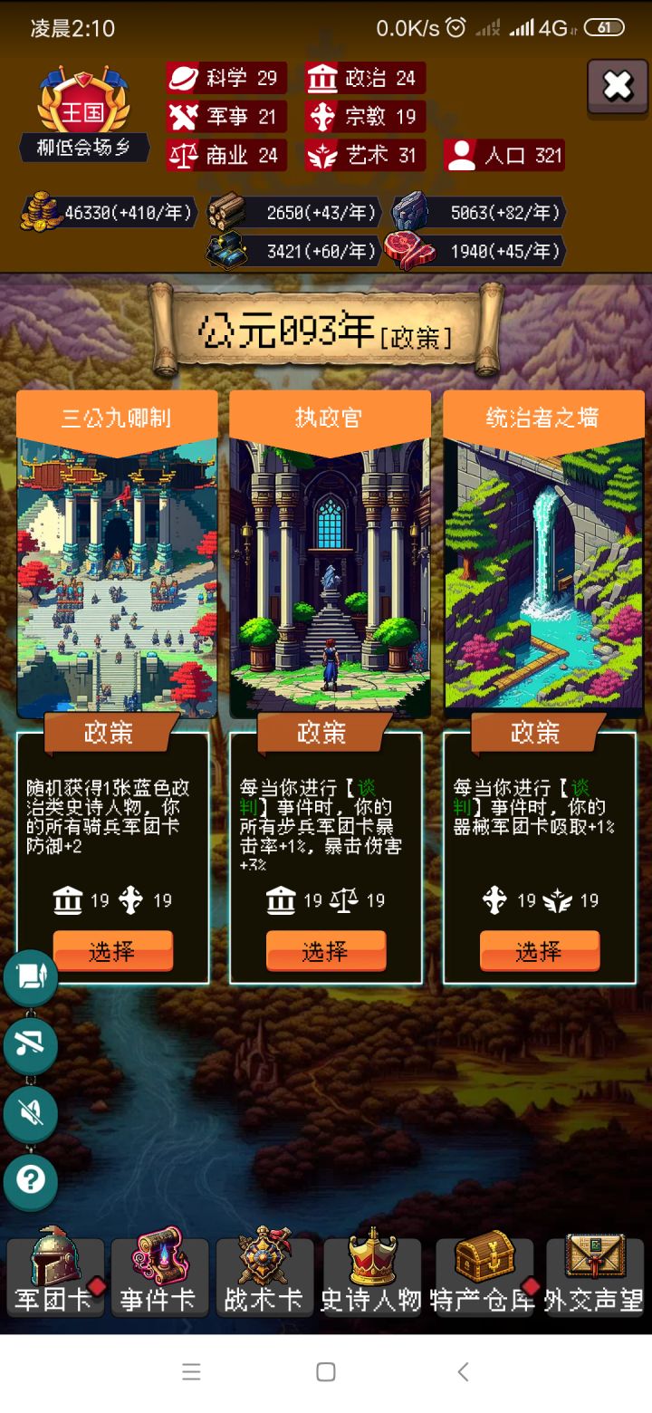 1、点外面的史书主要是>政治>科技军事:步甲2→步2→骑甲2→射弓2。因为开局没有圣职的军团卡,所以尽量去往步弓骑玩。政治:优先募兵制要提前另外俩一个等阶,之后是城镇化那一条路。这边不点拜占庭那个科技树一个都不点。科技:金矿,力学齐头并进。特产不点总结:以解锁为主不用升满,等全部解锁了再慢慢去升满。思路:军事一定要强大。也就是说你在里面要不断提升自己的军团强度,高星军团和战术卡以及兵种上限。2、要