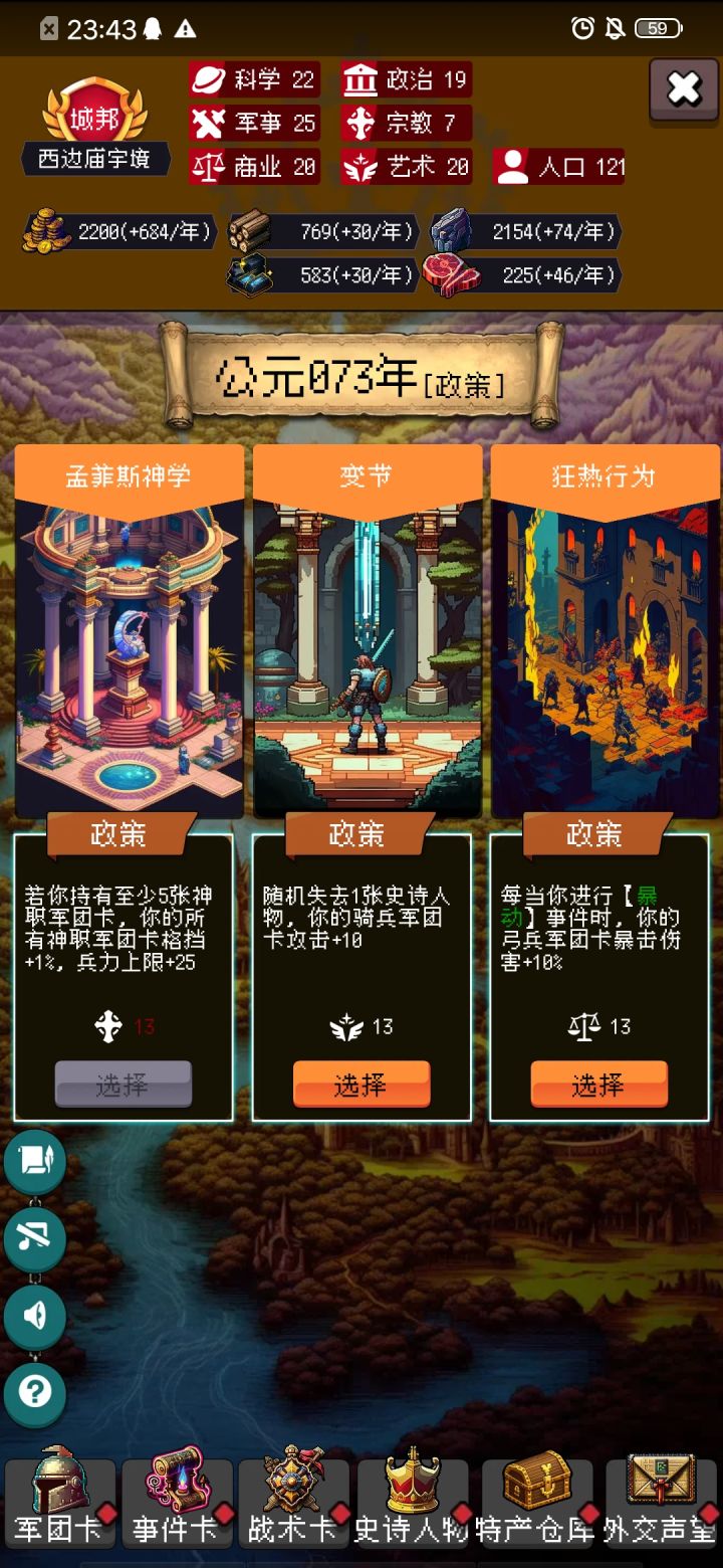 33年-53年 招贤纳士 :每次招募事件额外获得一个绿色史诗人物保甲法* *:每次发展事件步兵爆伤+5%以战养战:每次战斗事件粮食+12063年-83年 焚书坑儒* :失去一个神职军团,获得一个蓝色步兵军团,步兵军团攻击+8十一抽杀律*:人口-11,步兵攻击+693年-113年 执行官**(19政治 19商业):每次谈判步兵暴击+1%,暴击伤害+3%停战协议**(19政治 19军