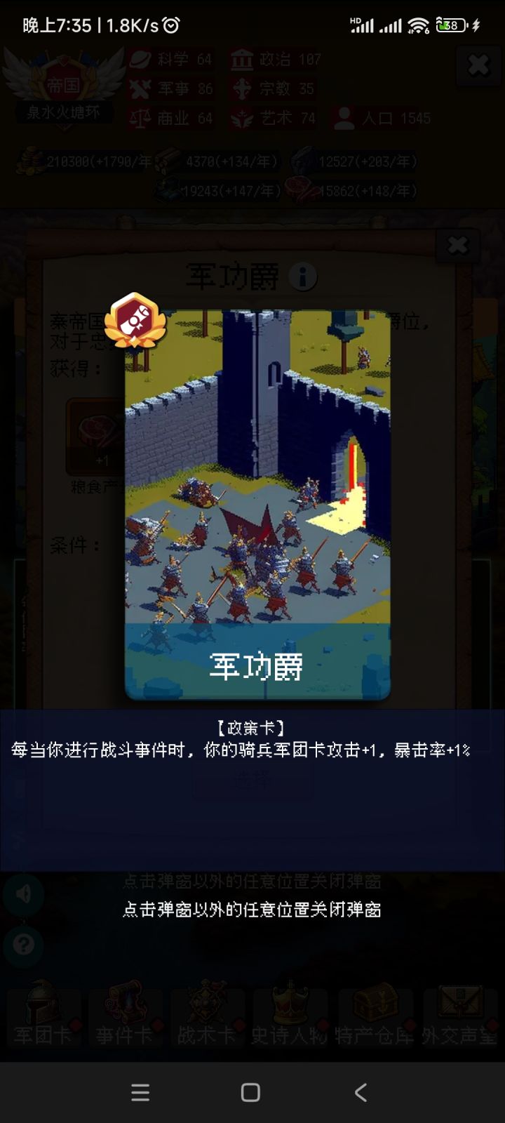 军功爵获取时间有点晚,主要三百年之后难度爆增,可以靠柏拉图(效果是随机给你一个政策卡),柏拉图靠氪金希腊卡包,然后商店买一张,现在诸葛亮也给,而且诸葛亮更强,诸葛亮不用氪金,就是肝了一些。开局刷一个军功爵出来,多发育二百多年战斗力档次就高很多