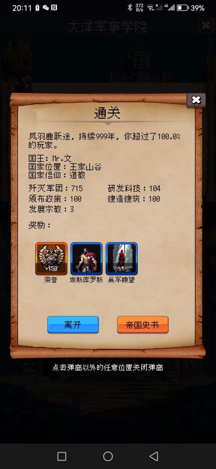 开局维西尔 中间尚武教育加挟天子以令诸侯后又来一个维西尔加五德后期属性根本死不了 后期电脑兵高格挡高无敌基本靠磨 攻击作用不明显 主要靠暴击伤害 器械带加防御的注意一下 没有五鬼搬运等防御叠起来根本打不动 后期注意一下人口输一次直接掉700多人口 中间有两次掉网 直接判输差点把我灭了 最后顺利999😄后面带士兵通关时的属性