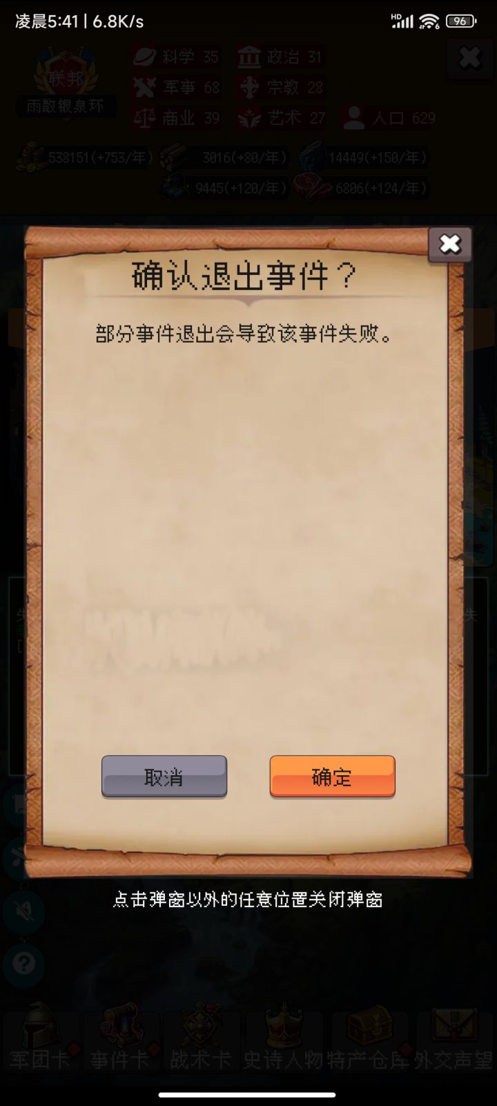 呵🙂抓紧用吧,不然修复了,反正我马上通了。1.跳过天灾8.18.28.38……每8回合固定天灾图一:回合7(招募,战术,外交等)点击选择然后马上点击右上角x,跳过回合,等待事件结束。图二:事件结束,选择:知道啦然后点击确认跳过回合,自动从第7回合跳到第9回合2.跳过危机危机不固定回合如果跳过天灾后发现是危机,保存再读取,回到回合8吃天灾。危机会被刷走。也可以在天灾选择中快速连