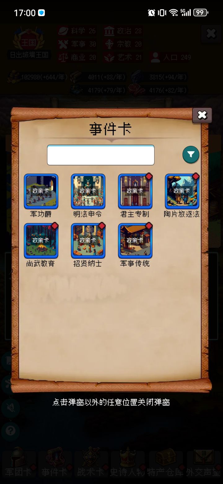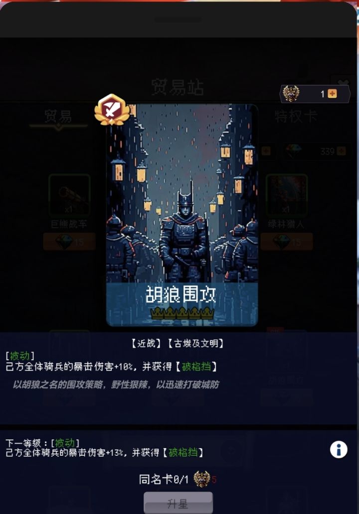 刚开始玩的时候,不用想着拿着一些绿色兵种蓝色兵种打到后面,这里面我个人感觉蓝色2星可以和零星橙卡一较高下,但是也就是拖延一下而已,最好是把送的兑换码都兑换了,有秦铁骑还是很不错的。之后注意打完100年才解锁差不多全部功能,贸易站和史书还是很有必要的,在贸易站里最好先在人物刷新出一个哥伦布,开局获得地理卡,刷出一个加6属性的城邦就差不多了,如果是斯巴达城就更好了,直接军事加15。贸易站里面零氪好买