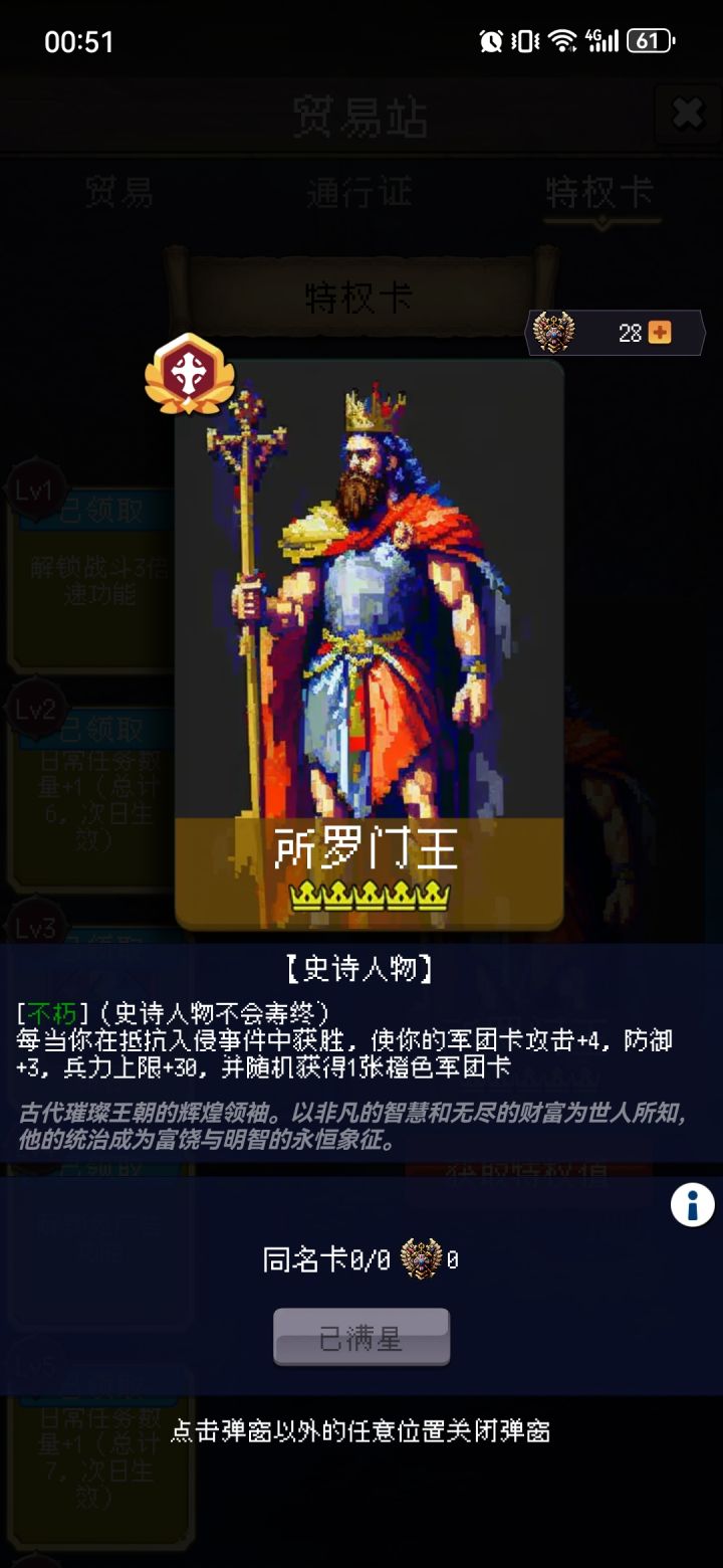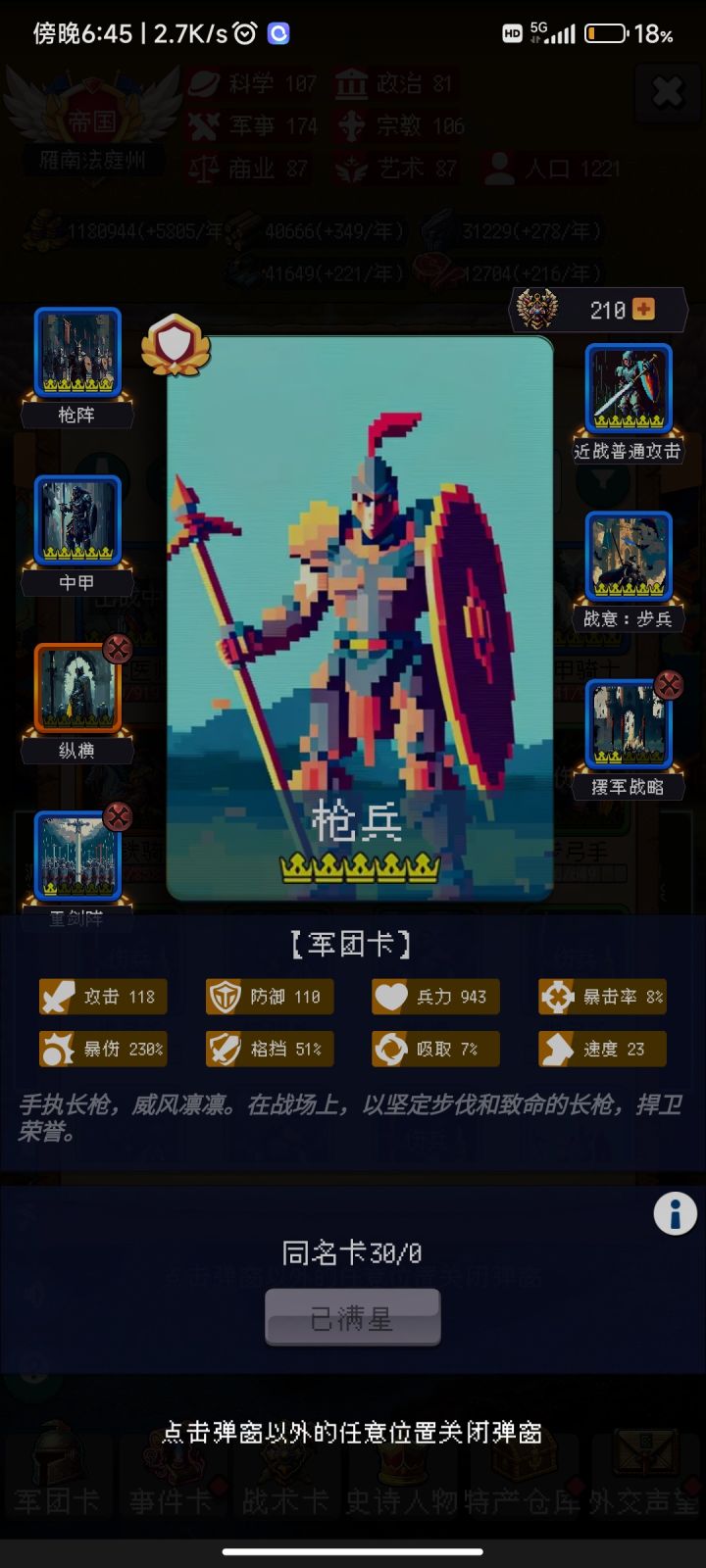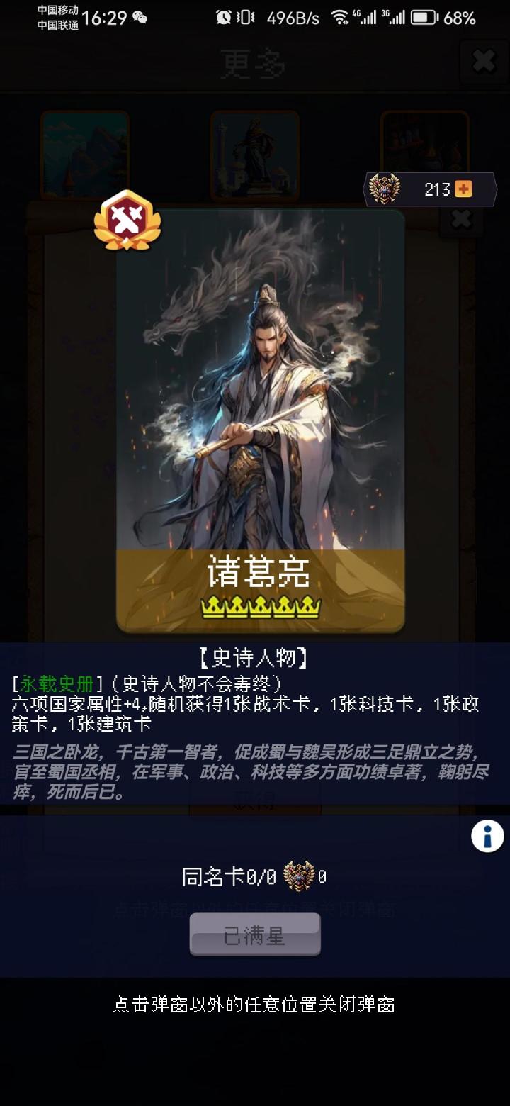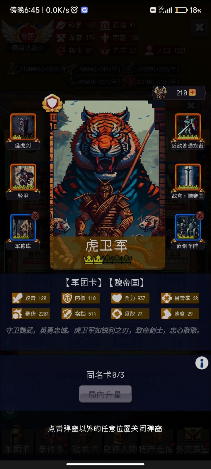 1.建议不要以活过999年为目标,活过300年就行后面都是堆数值,无聊奖励少。2.多刷刷战术卡找和自己想组的队有配合的卡组,然后刷一刷眼镜蛇突击等人权卡。3.首先要点起来的是国家六维和产量、战斗获得金币、突发事件获得人口这些,军队属性点两三点即可。#攻略