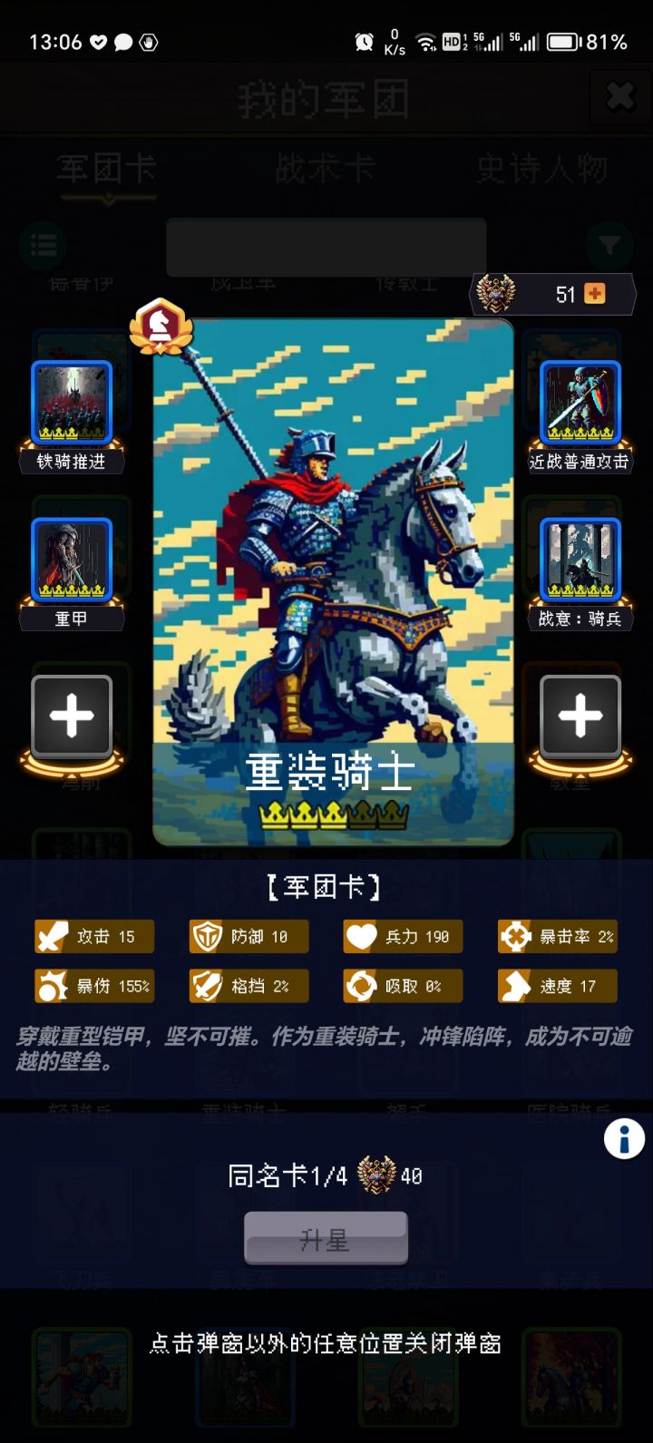 军团卡升级消耗:0-1星: 1卡; 5荣誉1-2星: 2卡; 10荣誉2-3星: 3卡; 20荣誉3-4星: 4卡; 40荣誉4-5星: 5卡;100荣誉0-5星:15卡;175荣誉