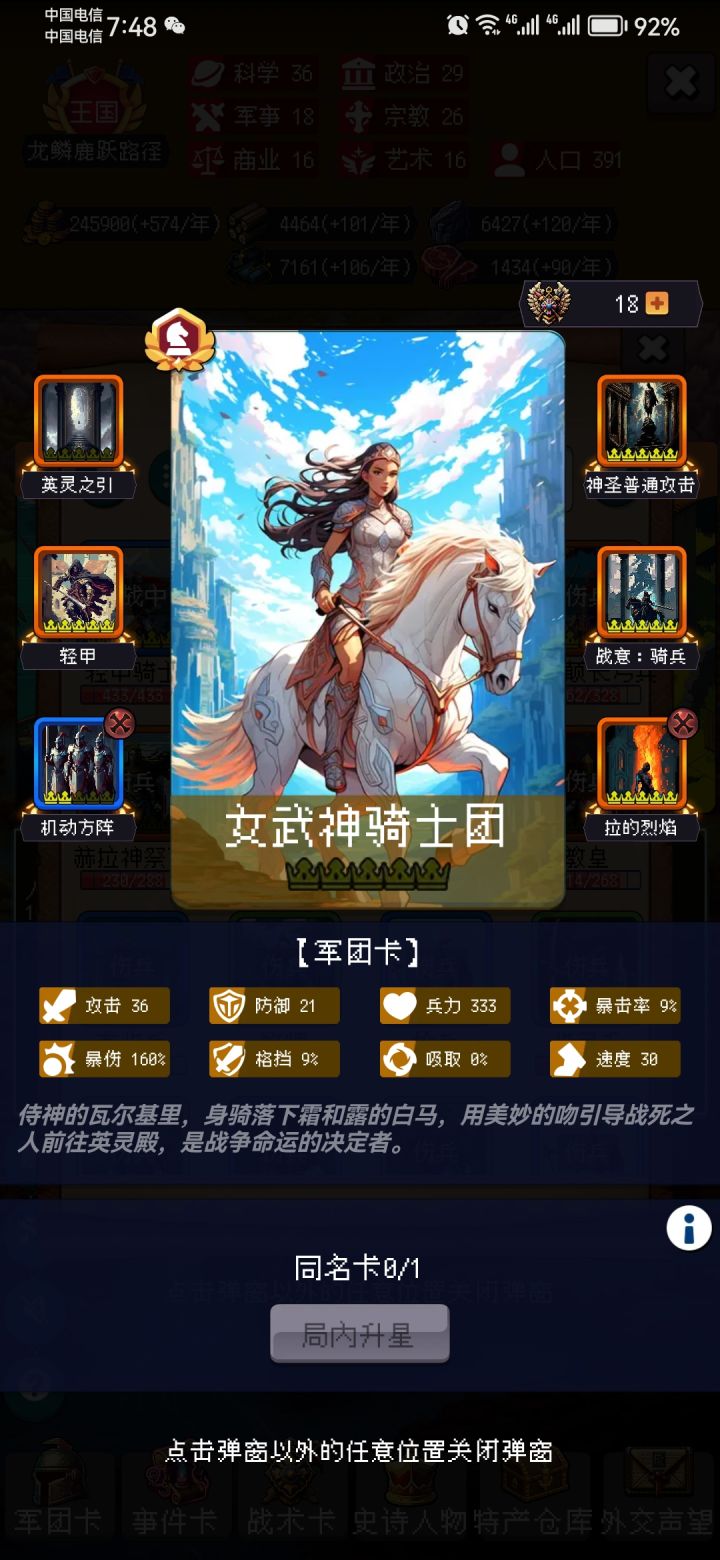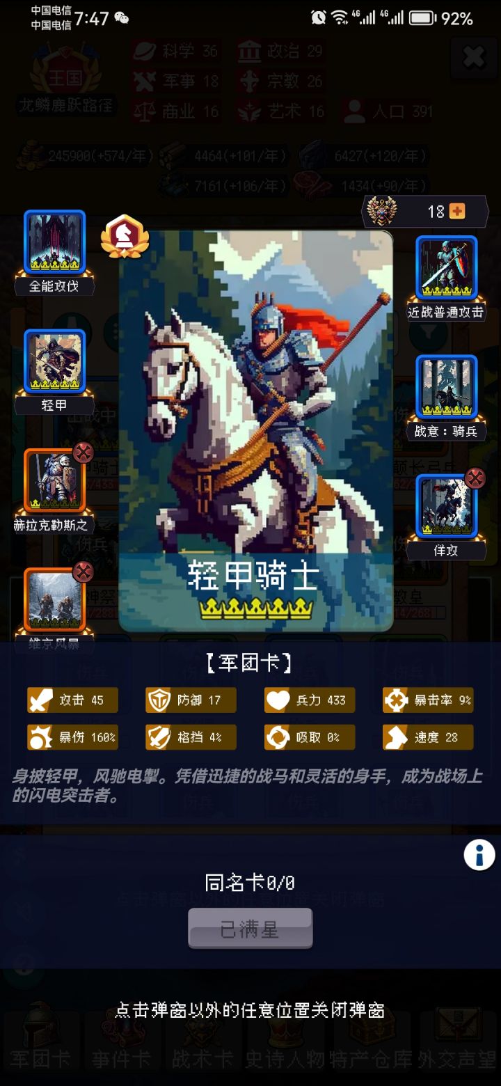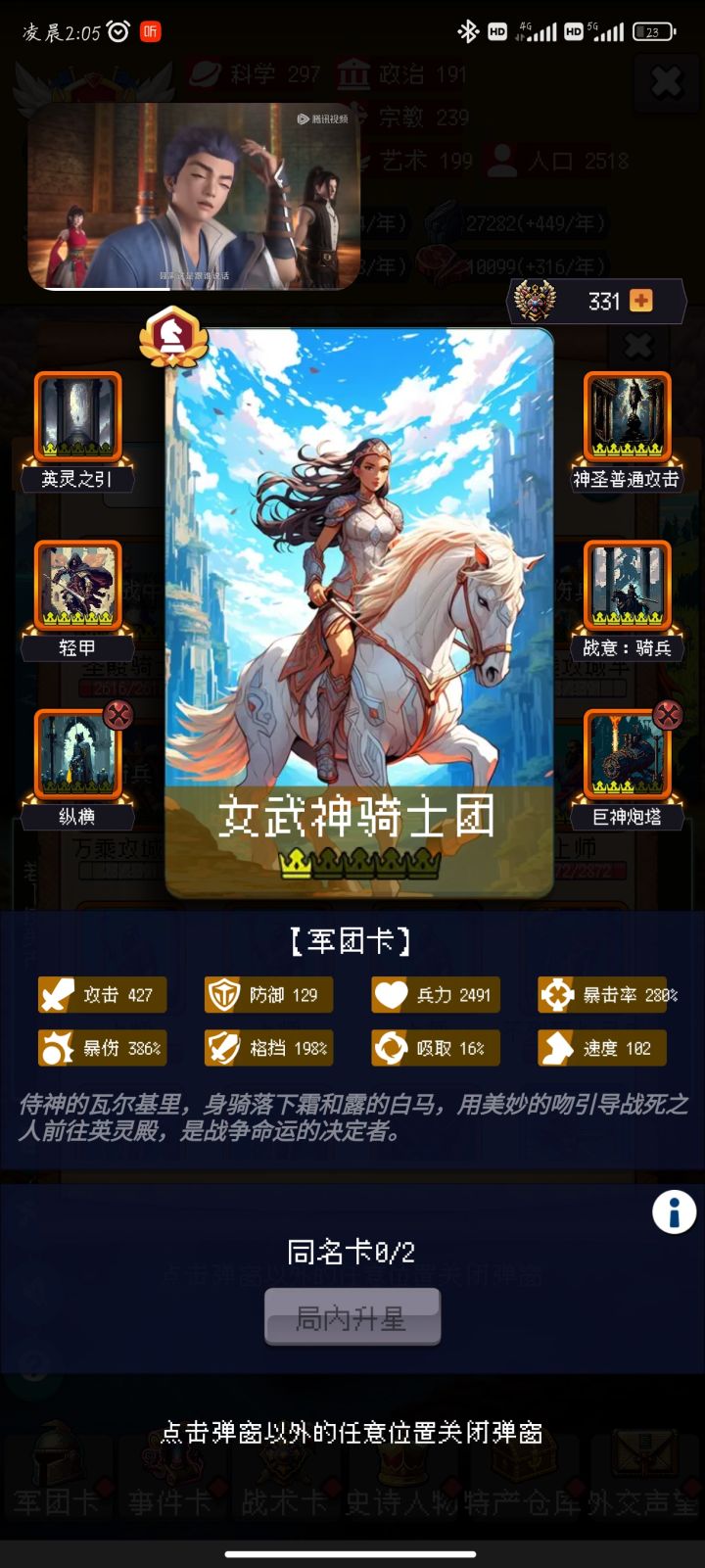 因为耐心不足,卡包全开了,当然,主要是维京也不小心开了。骑兵流氓阵,5星轻骑(白嫖)+0星女武神(克了1个)+0星虎卫军(图里1星是后面刷超市买的)。300年之前按大佬们之前的攻略只要不脸黑天灾翻车,基本稳了。300-400抓宝宝,龙骑那些克件就不用想了估计被屏蔽了。搞圣骑,圣骑4星开格子后换掉虎卫。中途运气好会开出女武(具体开路不明,我是稀里糊涂就发现包里多了1个女武然后合了一星)。400-99
