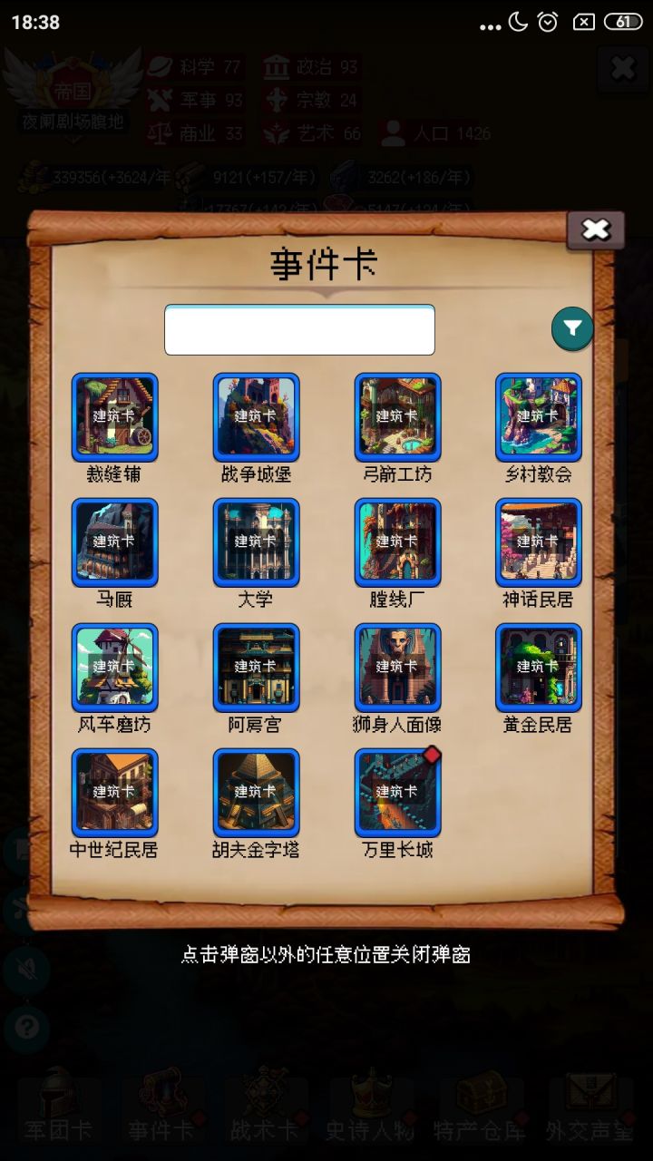 魏帝国(第7个卡包 需氪金 内有现版本可刷橙色战术卡—连弩阵)该卡包建议可氪 挟天子以令诸侯政策和其他战术卡均是很不错的 虎卫军更是步兵扛把子 该卡包性价比很高推荐3卡包或四卡包开局(3卡包:斯巴达 玛雅 魏帝国 或者秦帝国) (0氪可选充钱 魏帝国包需要氪金购买。。)局内宗教选择:天主教或者伊斯兰教 (天主教和伊斯兰教有宗教卡可增加宗教属性点数) 推荐原因:斯巴达的结盟和征服事件需要军事属