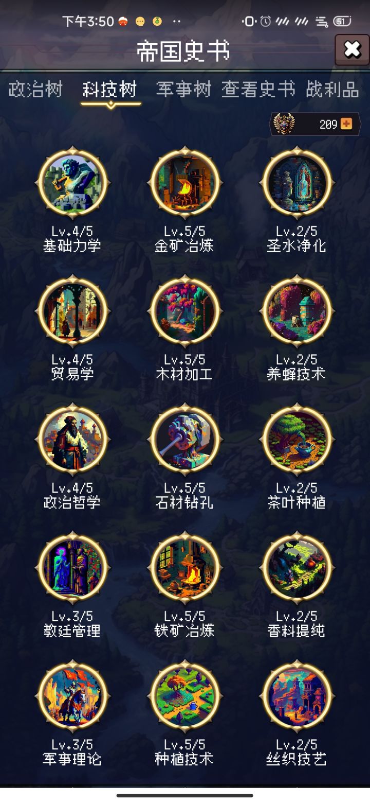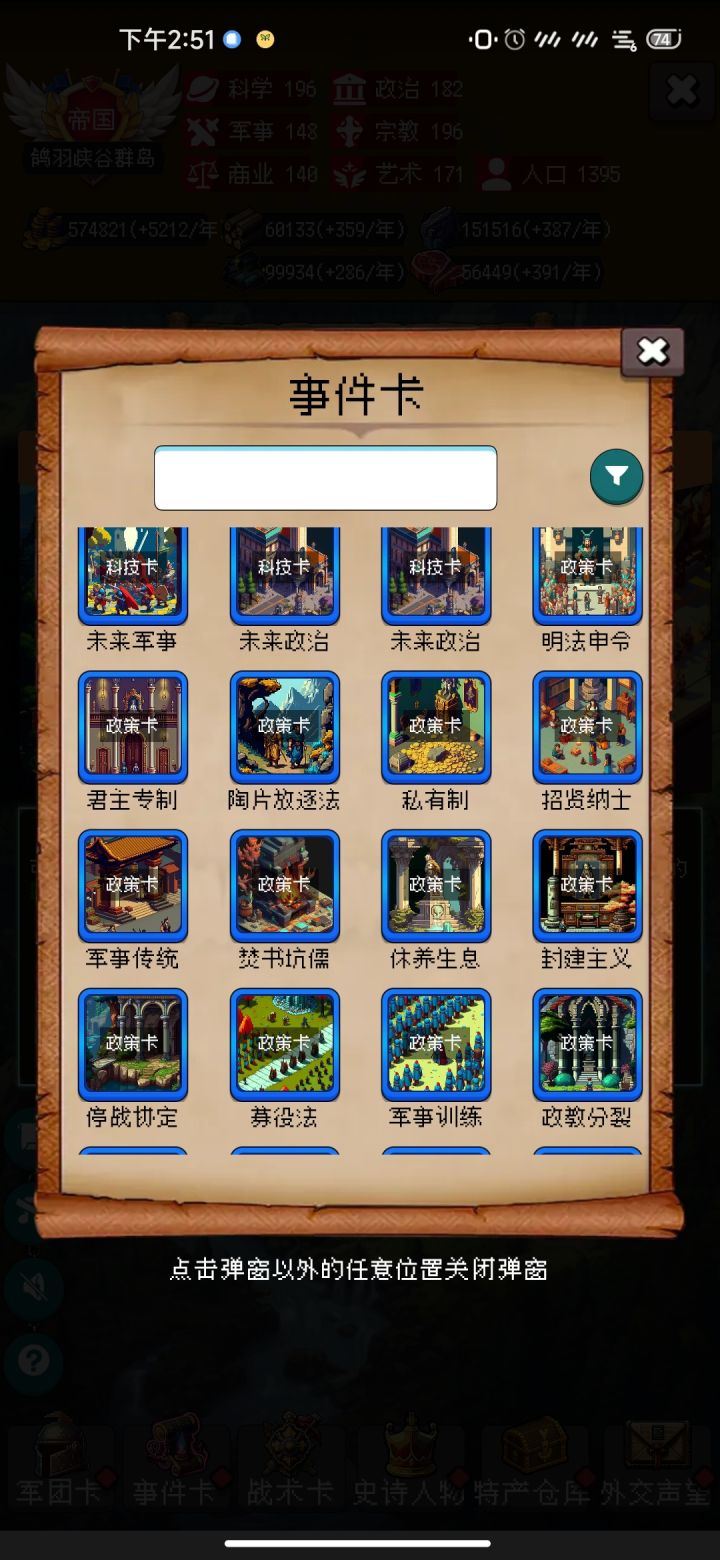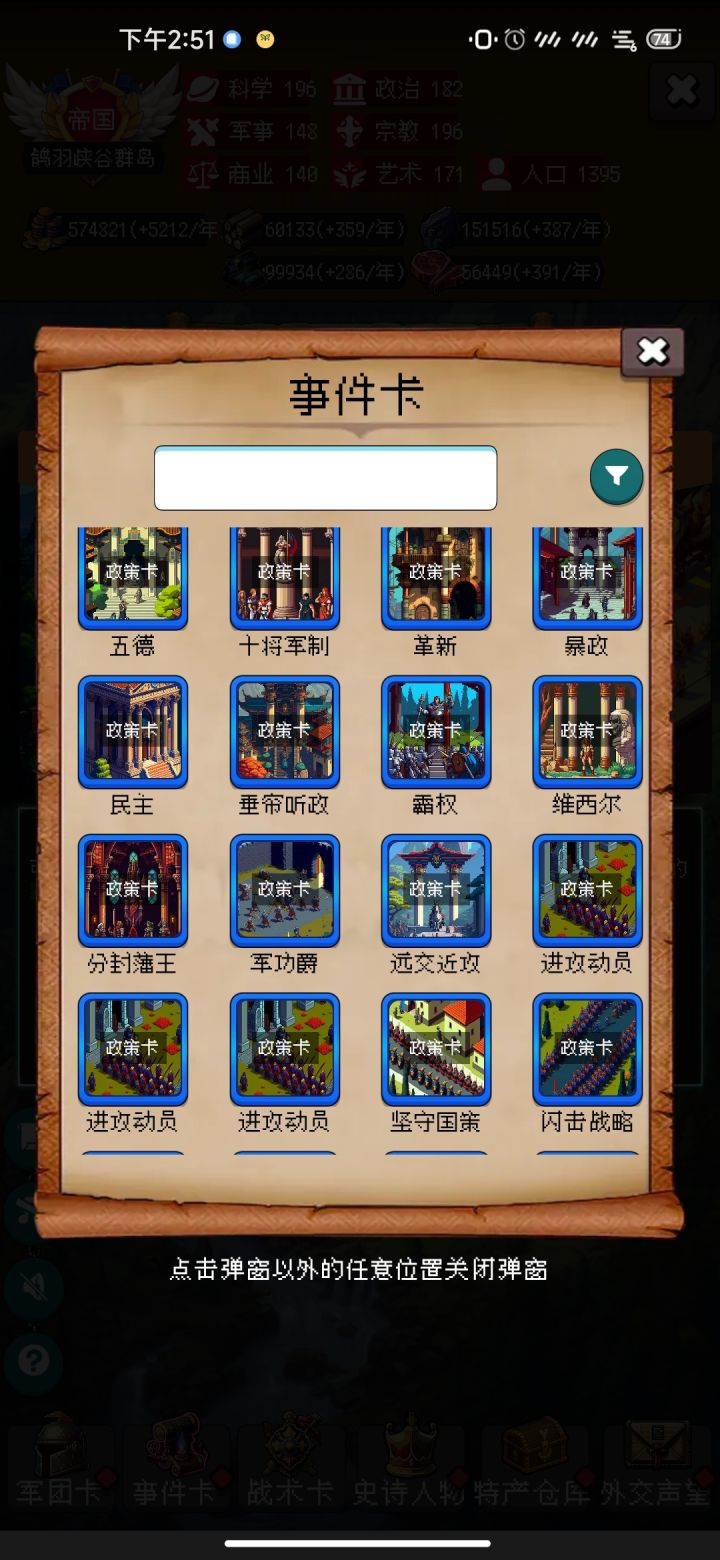 一、帝国战利品获取目前一共是14类奖励,可分为两大类事件,共15个来源。首先是通用的,特定的【谈判】【暴动】事件成功后获得。时间段较为固定,过去了就没了。1、剑战利品,游戏内【谈判】事件,62~89年,民主谈判,需要科学18,获得绿色帝国战利品。2、书籍战利品,游戏内【暴动】事件,92~119年,军营暴动,需要军事24或【秦始皇】,获得绿色帝国战利品。3、古卷战利品,游戏内【谈判】事件,
