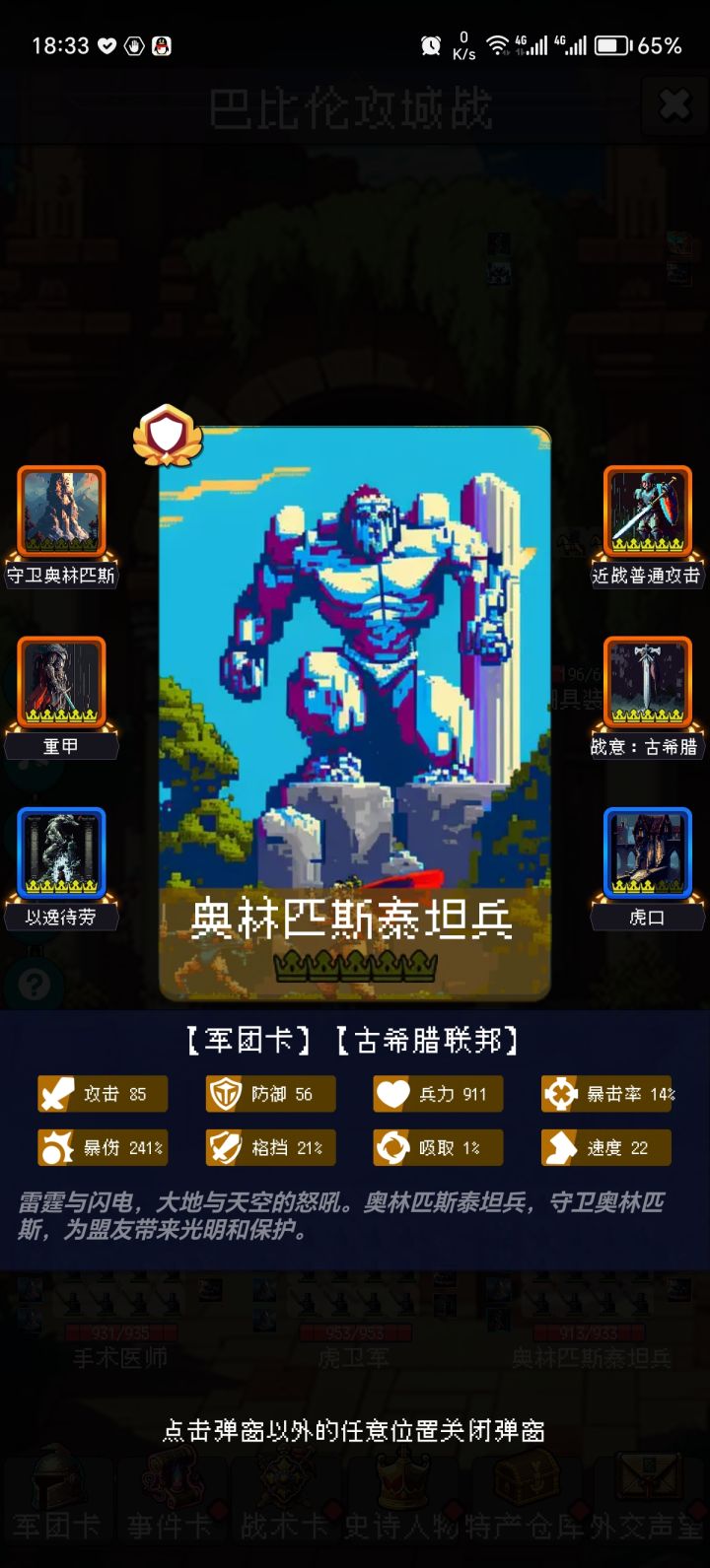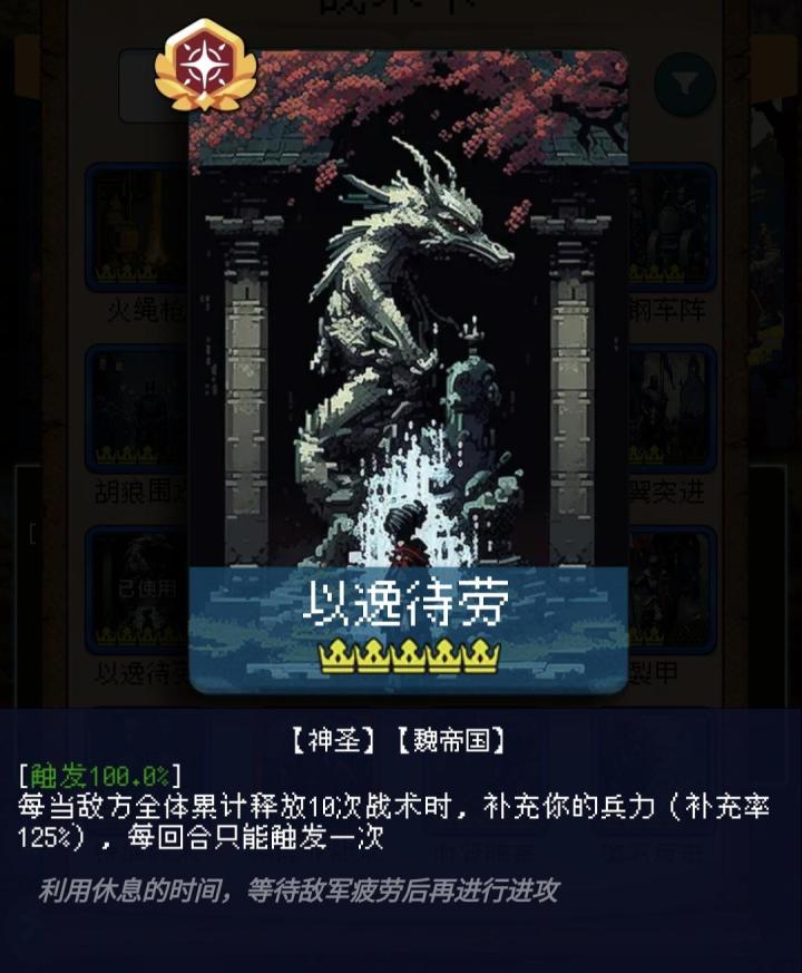 卡包选择:斯巴达(尚武教育)/魏(挟天子以令诸侯)/波斯选魏包后加上自己的以逸待劳,实现人手一个~~~长生军打法~~阵容(必带围师必阙,雅典娜或金苹果,可以带八金门锁和两面包夹,局里可以拿个两面包夹用,其余任意输出卡)~奥林匹克泰坦兵(最好要一个):能额外提全体高兵力,全体友军免疫吸取。装备佩戴以逸待劳/围师必阙(全体敌方步兵军团禁用触发战术)~虎卫军(额外增加自己的普通攻击次数):装备