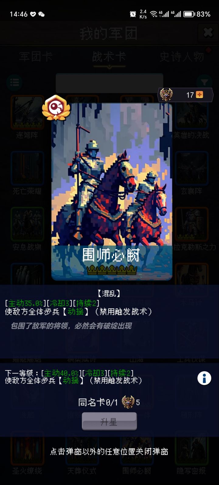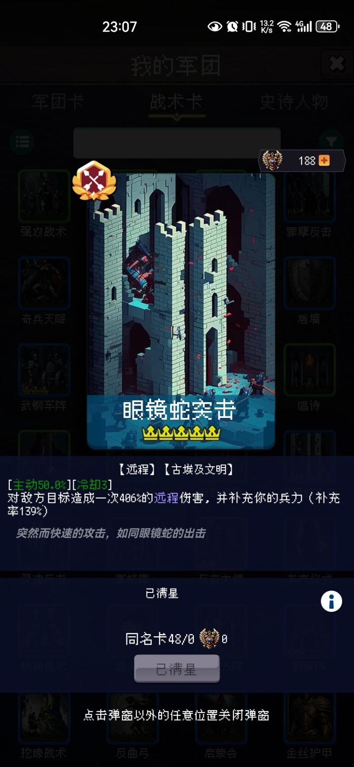 经历了三次通关后的心得感觉只要运气好,拿了很多正确政策后,商店的军团战术都不是刚需。因为200关后,会在入侵战斗中,获得你需要的群攻骑兵军团卡,奇袭战中获得你需要的战术卡。商店买的,只是锦上添花而已,如果真要买,建议买绿色军团卡跟战术卡,凑成就奖励。战术卡,没必要强求,有则更好,没有也能玩。#攻略