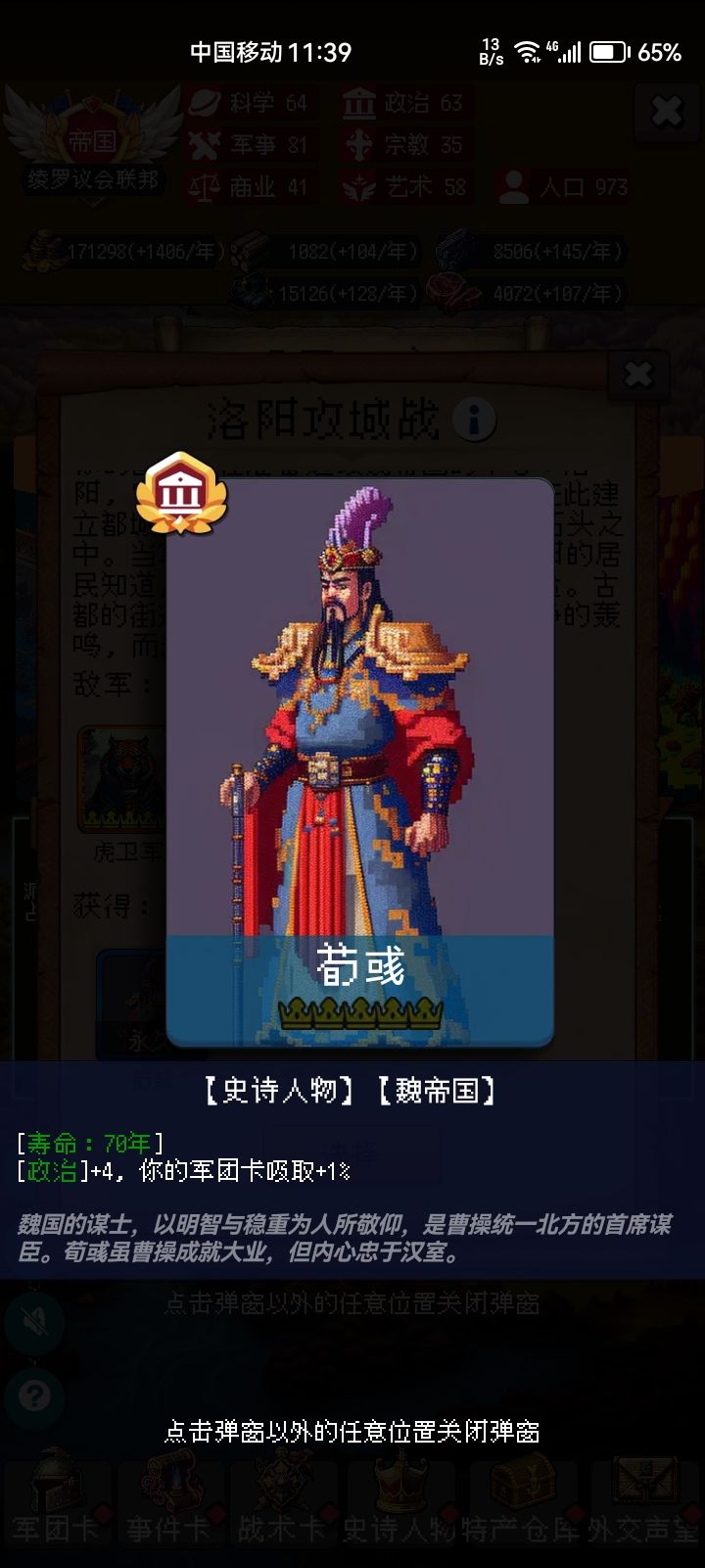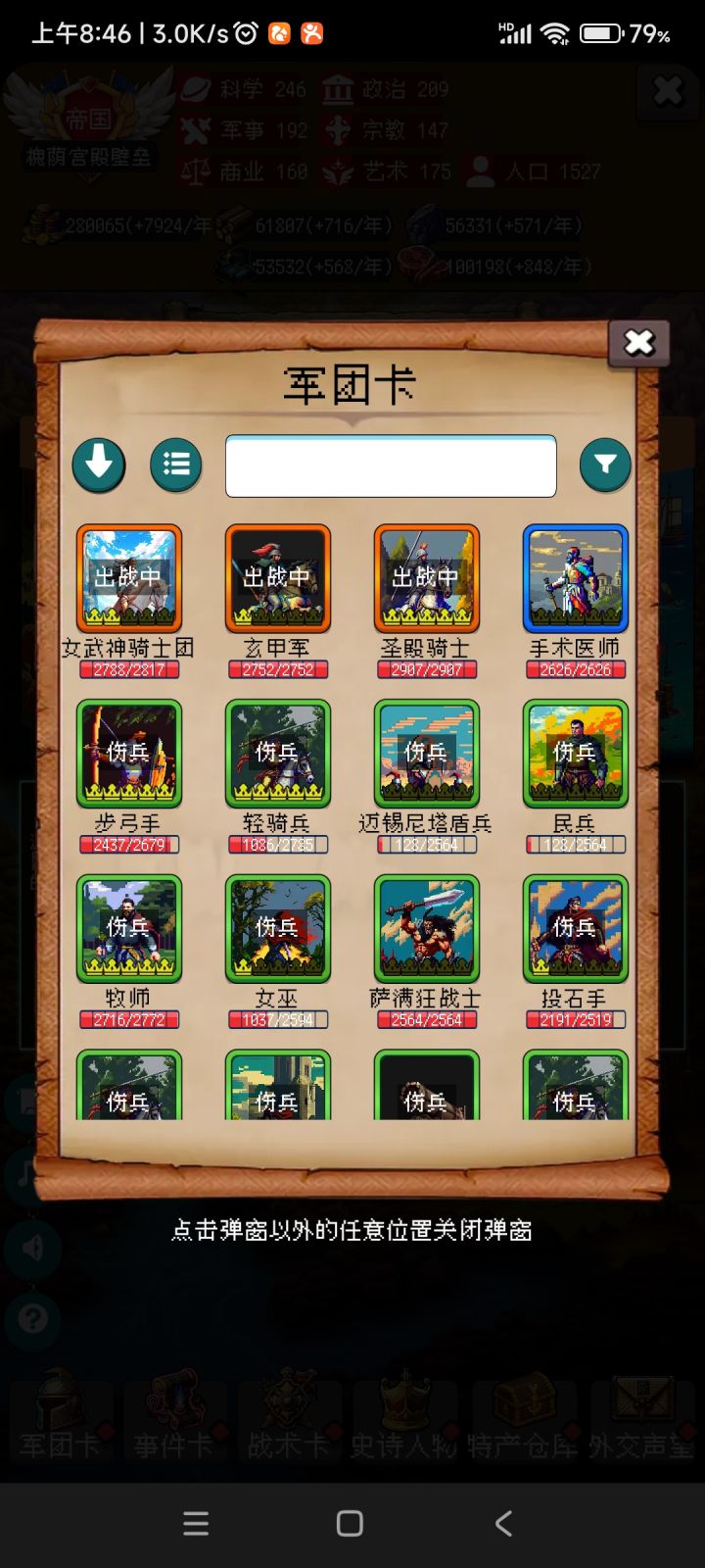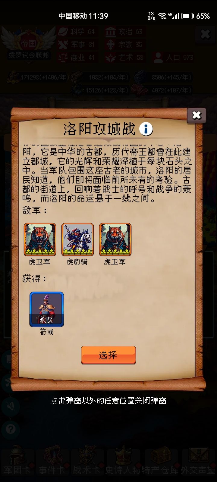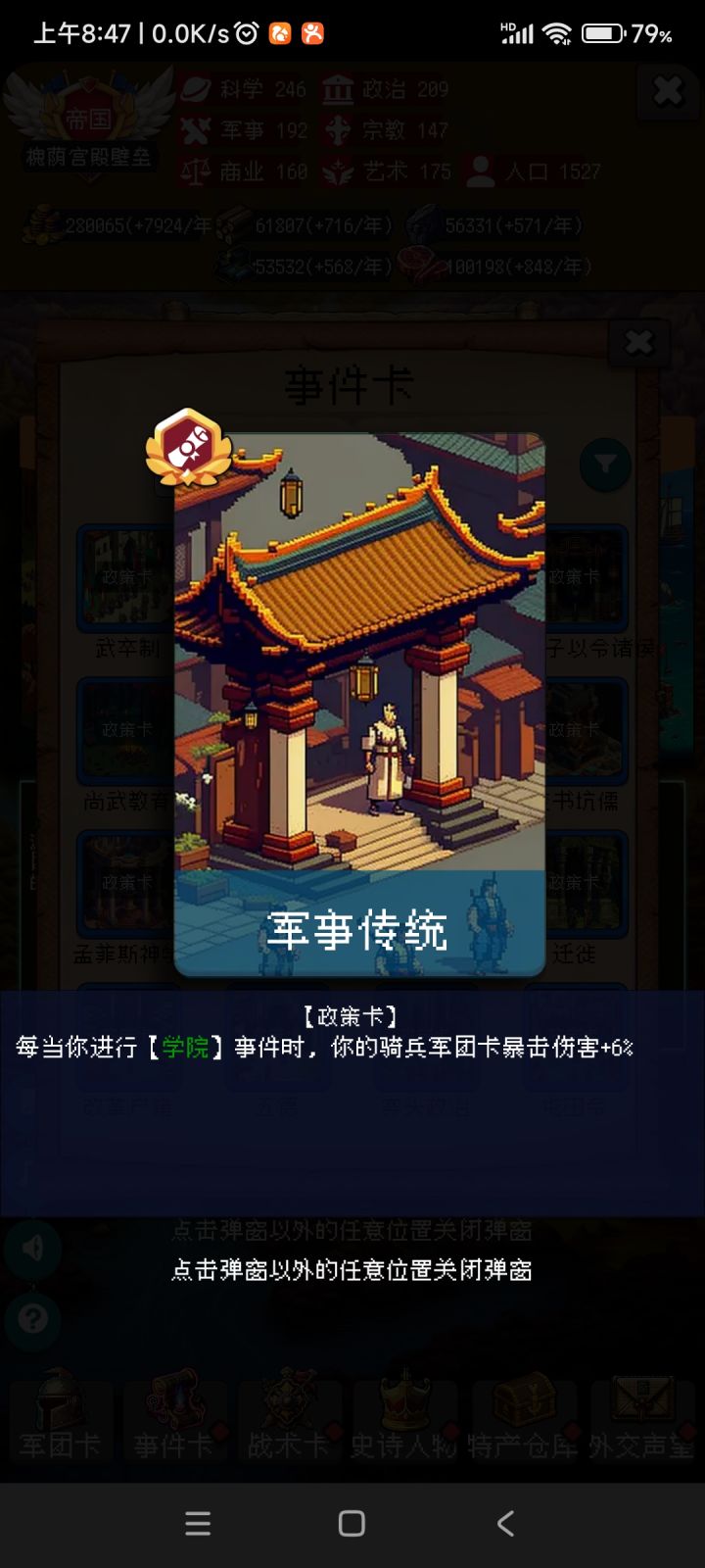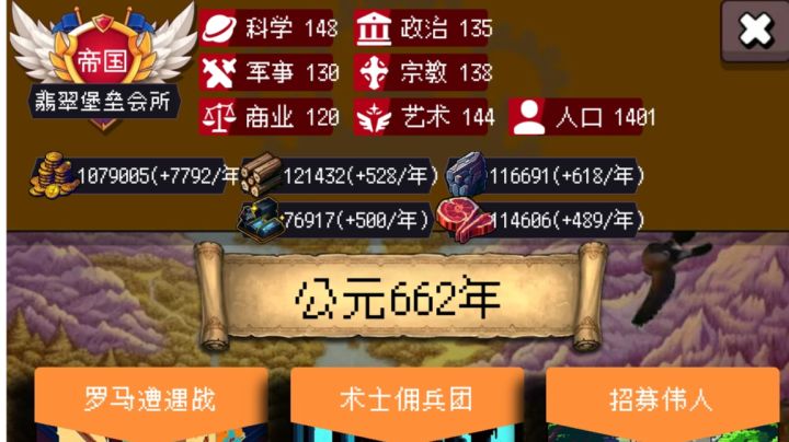 首先,999年其实很简单,老实说400年后就是无聊的重复刷事件,所以关键是先活到400年,并拿通过金字塔刷到所罗门,后期基本都是叠buff。如图,我玩的是骑兵,拿了一张政治卡叠骑兵暴击伤,基本后期一刀一群小朋友,但也侧面体现了速度的重要性,因为后期基本小怪人手一张战争献祭(无敌),所以速度慢了,起码要五回合才能把小怪捶死。然后兵种的话,女武神和玄甲都可以靠所罗门刷,玄甲40%的增伤+群攻,爽的