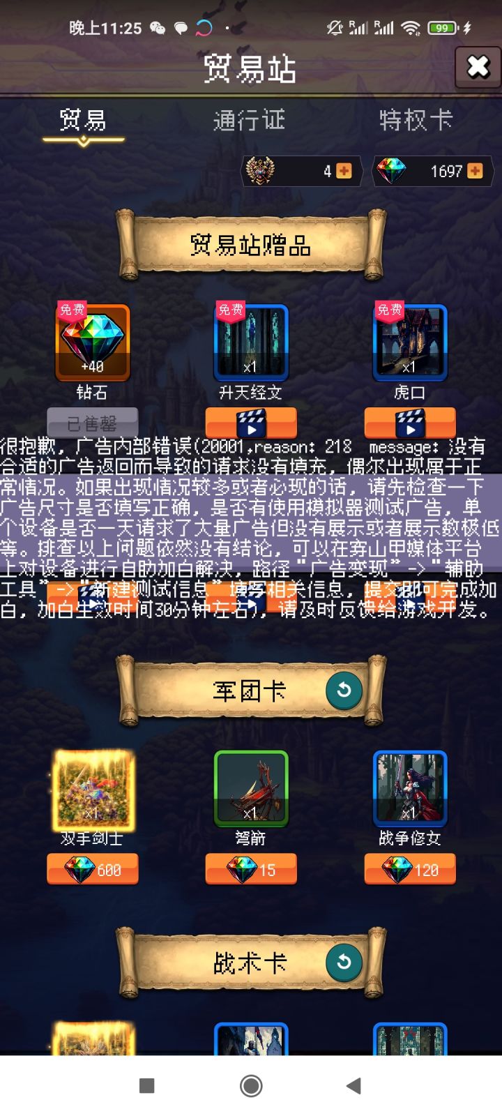 今日贸易站看广告拿军团卡、战术卡和人物卡的时候直接卡死,重启游戏,杀死进程也不生效,重登还是看不起广告拿不到卡牌,不知道啥原因,有没办法解决,这种卡牌还是需要收集一下的。