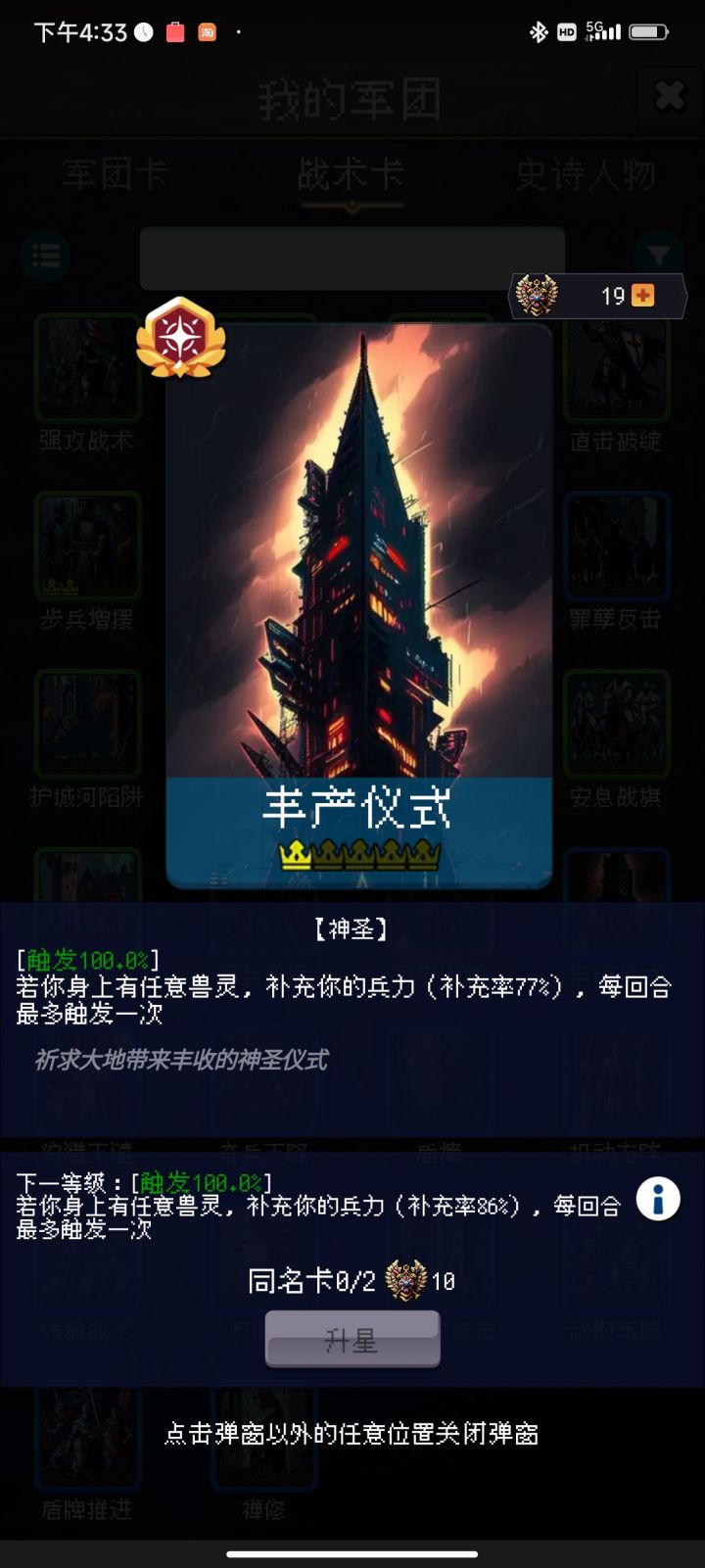 到后期大量重复卡牌堆积,一些高级的伤兵又不堪一战。希望可以增加一个重复升级的功能。可以是牺牲一张同名牌,给高级牌加血,也或者是在有高级牌的情况下,低级牌也可以升级。同时加上锁定卡牌,防止误融高级牌。