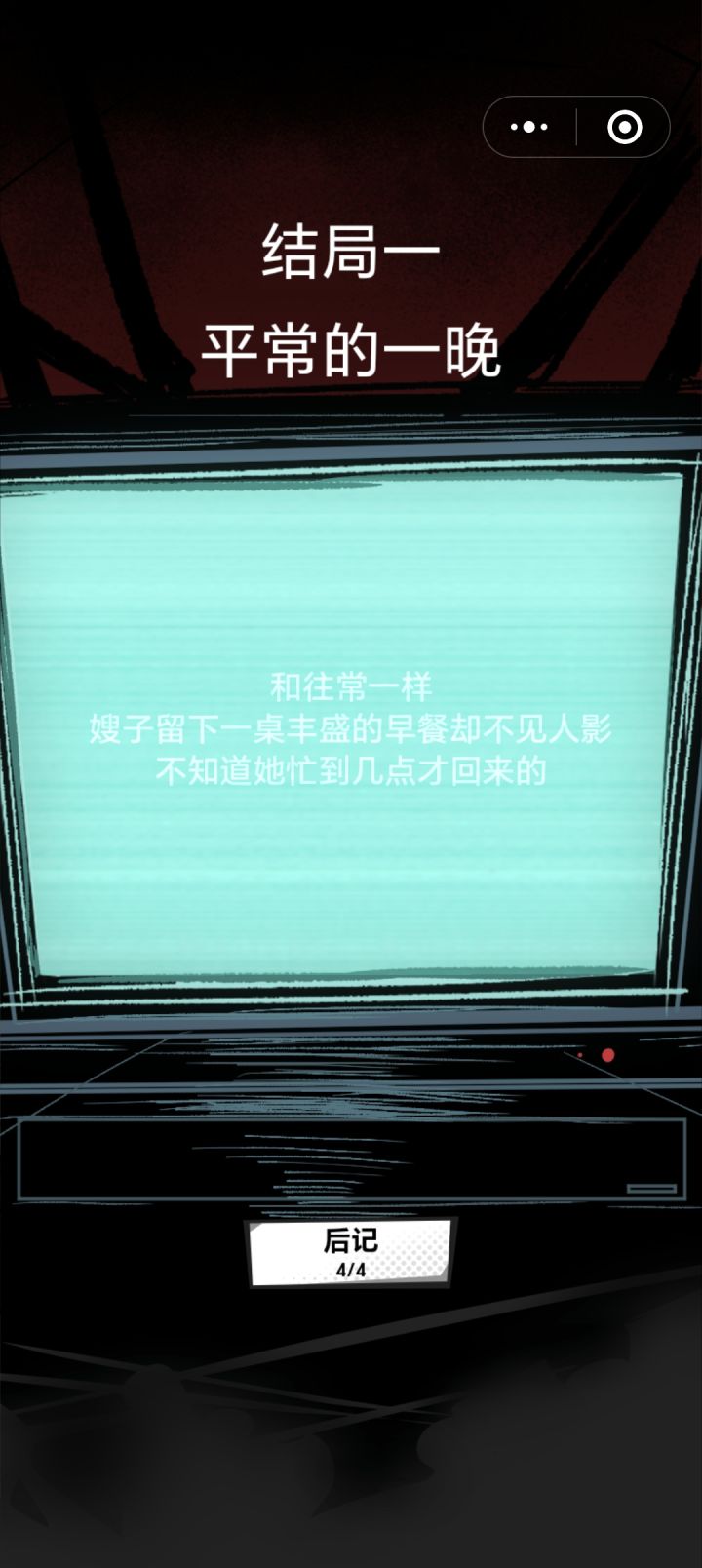 普通结局:直接睡觉/你看了纸条后按要求浇花后睡觉结局二:接了电话后,用水浇花结局三如下:结局四:你用鲜血浇花后再发现这个秘密后记ps:目前为止人间诡视新编只有三篇,也就是我发的三篇攻略,以后如果更新的话再说吧 小程序里面还是有类似人间诡视类型的关卡,我体验了一部分,感觉几个比较高质量的关卡(盘丝洞怪谈,午夜之旅,菊花姐姐,盗亦有盗……) 每个人都有不同的想法,可能有一些优秀关卡我没提