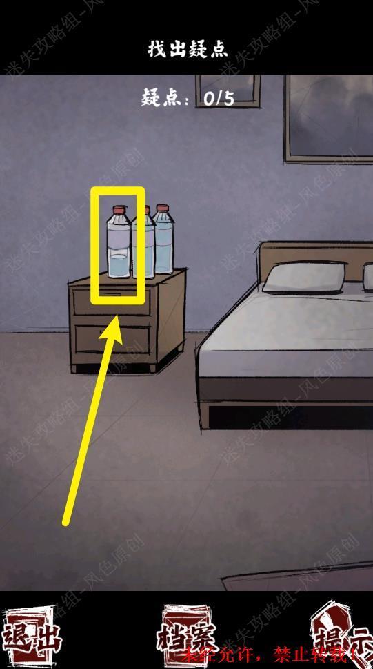 攻略作者:迷失攻略组-风色未经许可,禁止转载,侵权必究!💡更多图文+视频攻略可搜公众号🔎迷失攻略组(也是第一时间放攻略的地方(^U^)ノ点击跳转: | | | | | | | | | | | | | | | | 第十关攻略93.结局1【正确选择】:疑点:左方没喝完的水瓶,床上的凹痕,床下的脚印,歪斜的地毯。 93 93.194.进入右方的洗手间。 94#攻略#游戏安利#游戏推荐#单机游戏