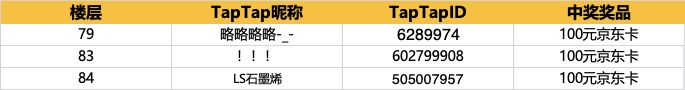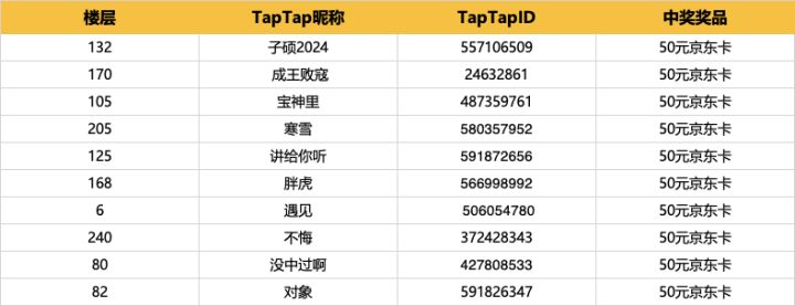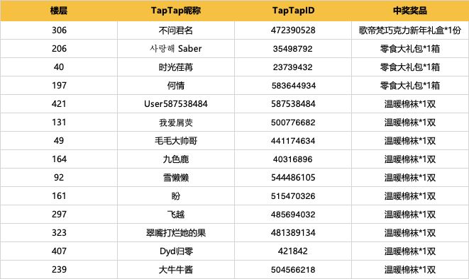 锵锵锵~小光来开奖啦!截至2月17日24:00,有效回复楼层达251层,恭喜指挥官们解锁奖励!以下是通过随机数生成器抽取的获奖名单:请中奖用户扫描文章底部的二维码添加「小曙」,并于7日内提供taptap主页截图、taptap昵称及个人收货信息。如未能按时提供收件信息,我们将取消您的奖励。请留意好时间哦~--------------------------------------------