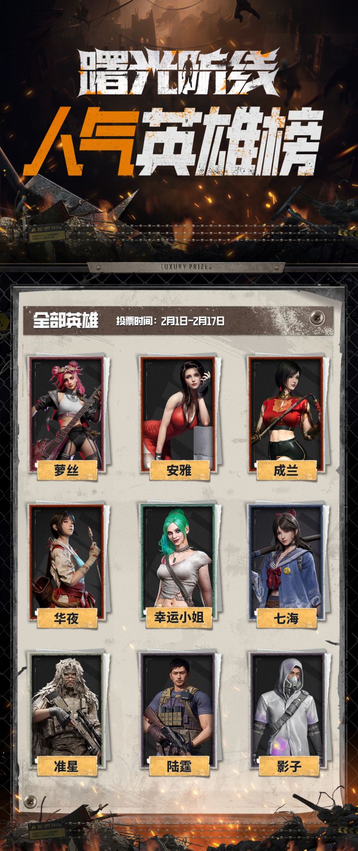 各位指挥官,大家好~今天是一个特别的日子……什么?你说情人节?不好意思,阿光在末世的泥潭摸爬滚打多年,早已没有那种世俗的欲望……爱情,只会影响我上膛的速度!(叉腰好啦,言归正传,这个特别的日子其实是——曙光防线一年一度的人气英雄选拔赛,正式拉开序幕啦!!!经过前面几期的角色爆料,以及刚刚结束的「曙光测试」,相信不少指挥官心中都有自己喜欢的英雄角色~虽然小光是母胎单身,但——我也是有心中的白月